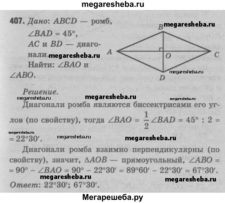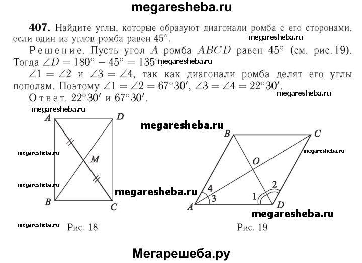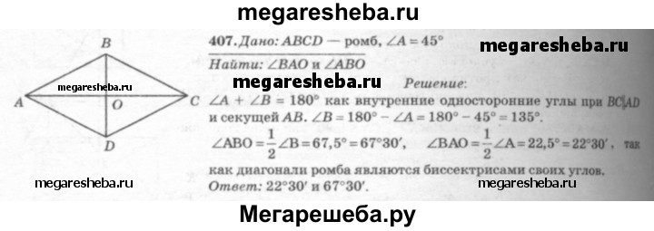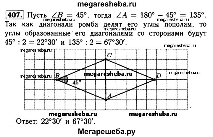 407 Найдите углы, которые образуют диагонали ромба с его сторонами, если один из углов ромба равен 45°.