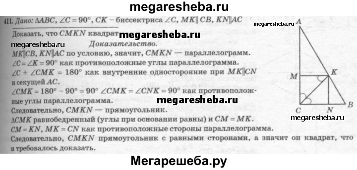 411 В прямоугольном треугольнике проведена биссектриса прямого угла. Через точку пересечения этой биссектрисы с гипотенузой проведены прямые, параллельные катетам. Докажите, что полученный четырёхугольник — квадрат.