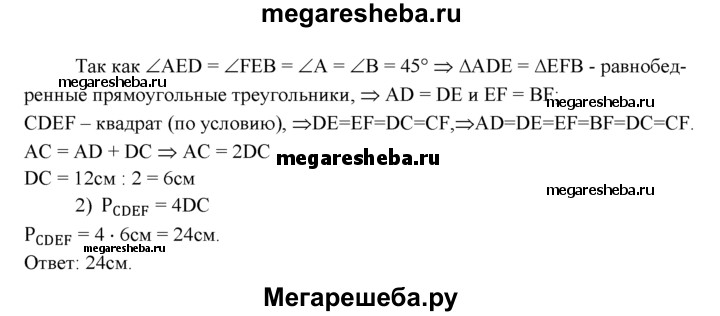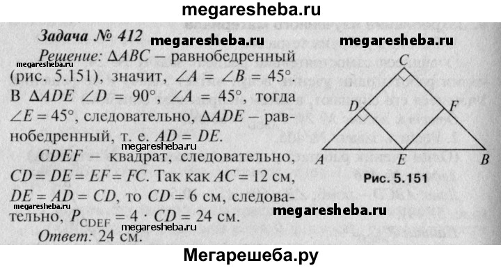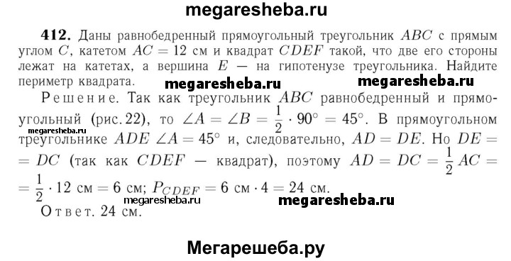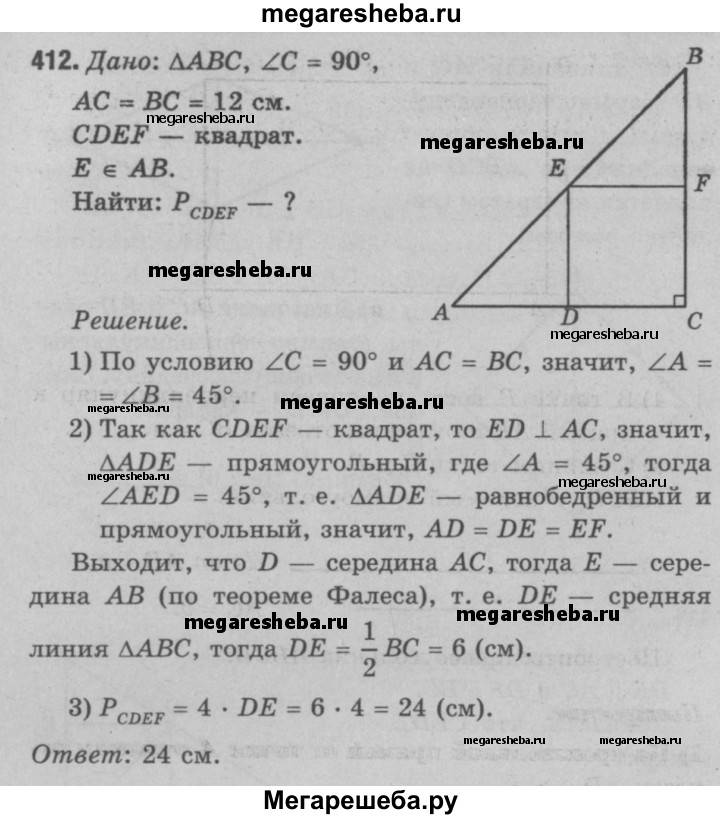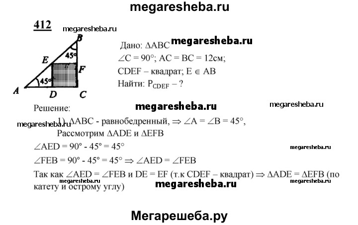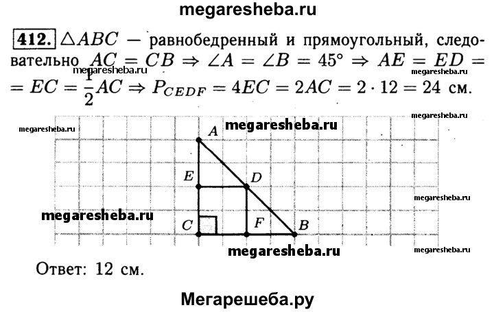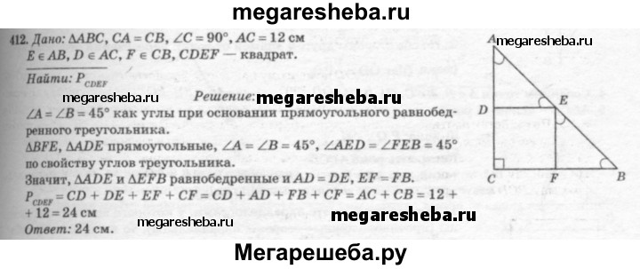 412 Даны равнобедренный прямоугольный треугольник ABC с прямым углом С, катетом АС = 12 см и квадрат CDEF, такой, что две его стороны лежат на катетах, а вершина Е — на гипотенузе треугольника. Найдите периметр квадрата.