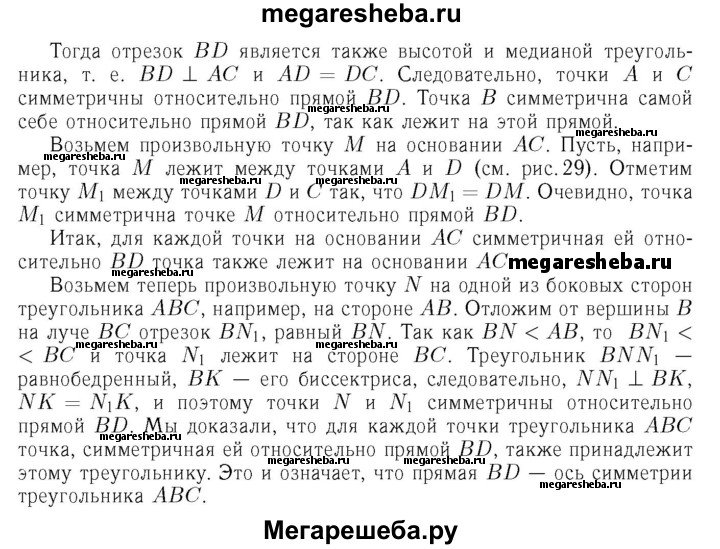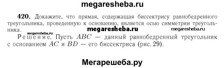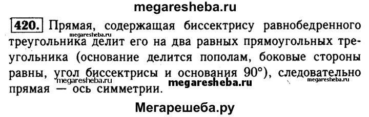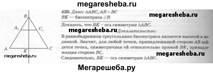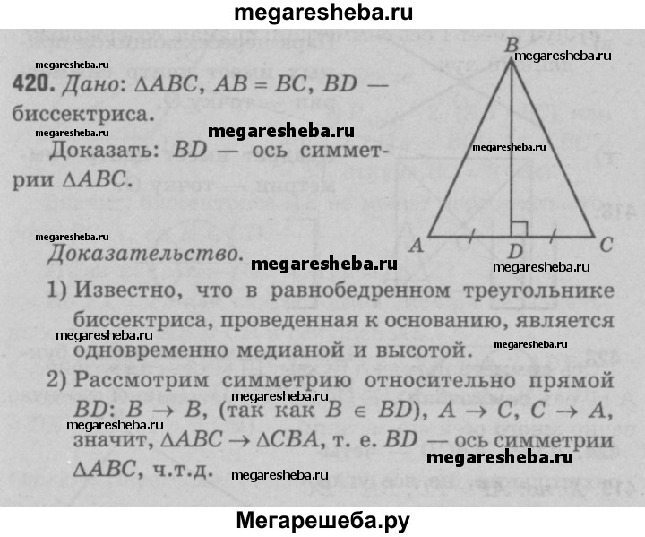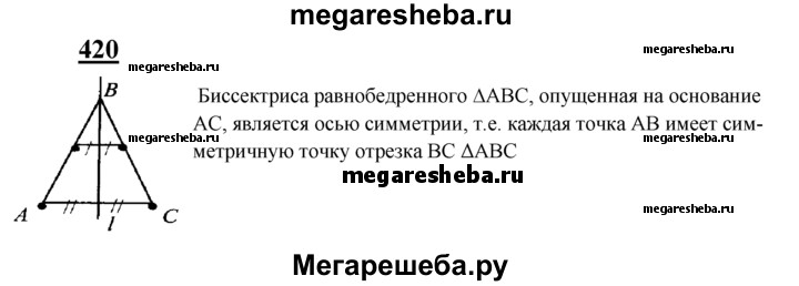 420 Докажите, что прямая, содержащая биссектрису равнобедренного треугольника, проведённую к основанию, является осью симметрии треугольника
