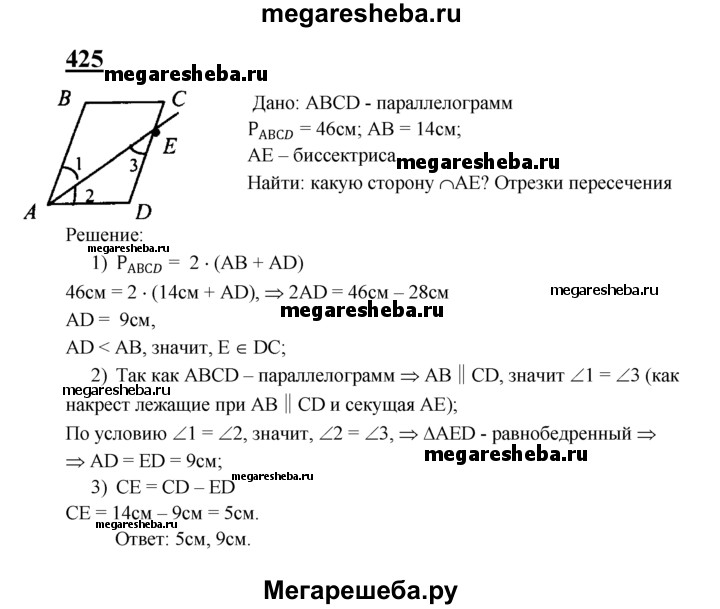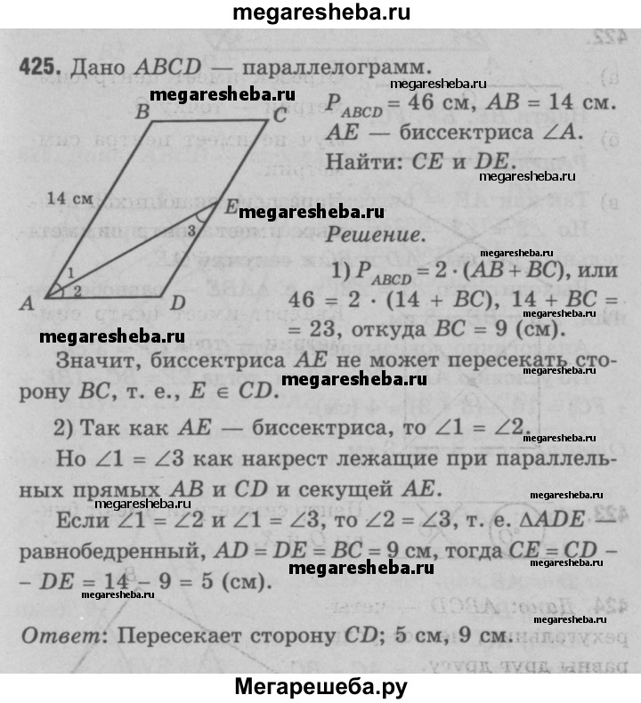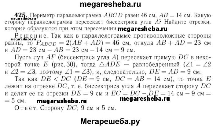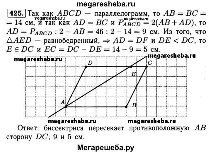 425 Периметр параллелограмма ABCD равен 46 см, АВ = 14 см. Какую сторону параллелограмма пересекает биссектриса угла А? Найдите отрезки, которые образуются при этом пересечении.