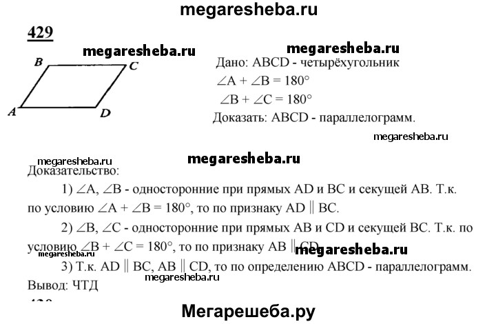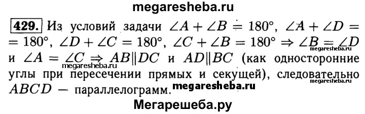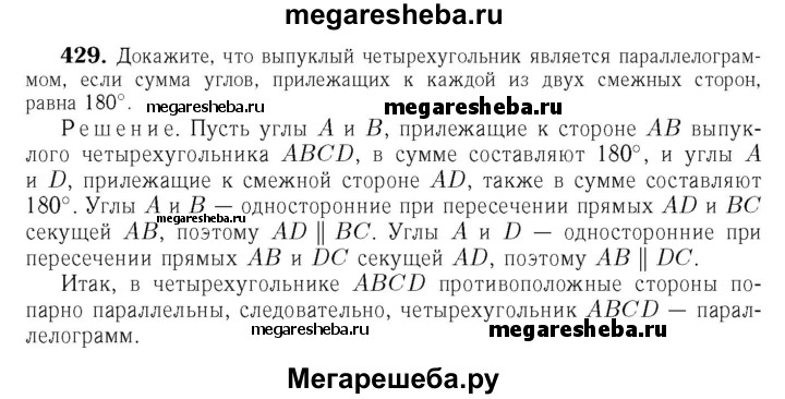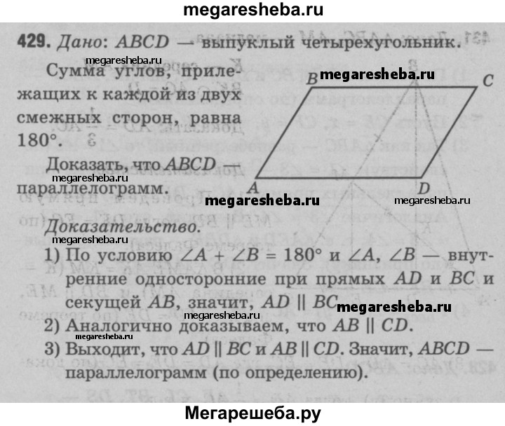 429 Докажите, что выпуклый четырёхугольник является параллелограммом, если сумма углов, прилежащих к каждой из двух смежных сторон, равна 180