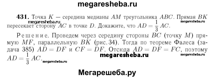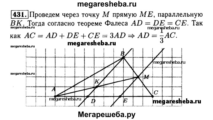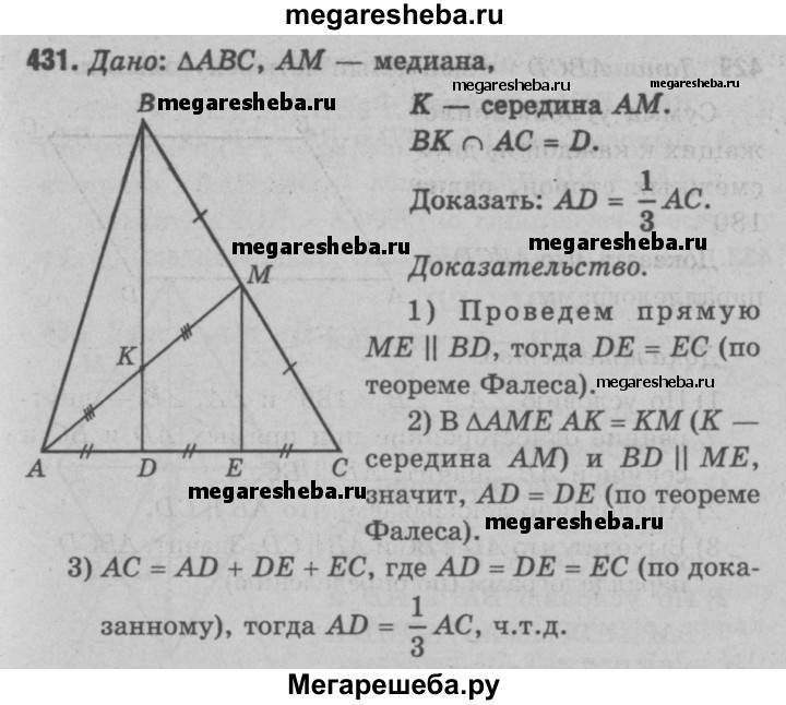 431 Точка К — середина медианы AM треугольника ABC. Прямая ВК пересекает сторону АС в точке D. Докажите, что AD = 1/3АС.