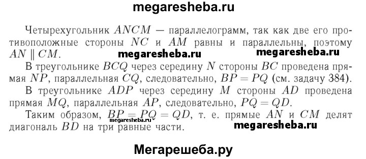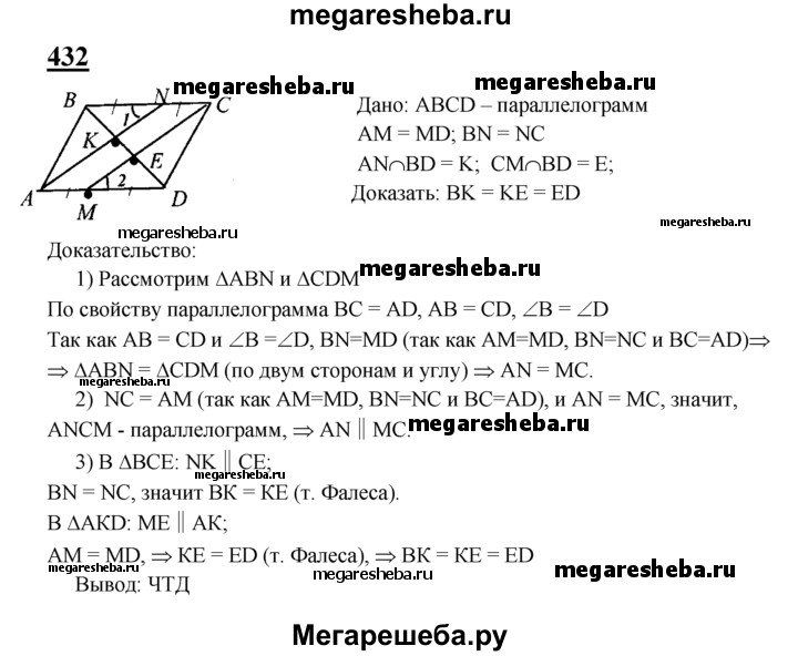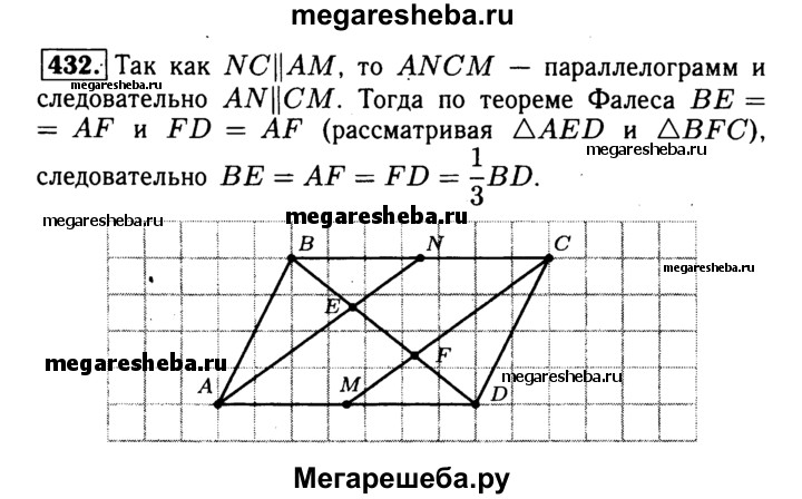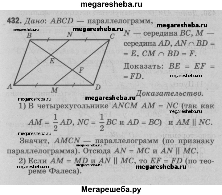 432 Точки М и N — середины сторон AD и ВС параллелограмма ABCD. Докажите, что прямые AN и МС делят диагональ BD на три равные части.