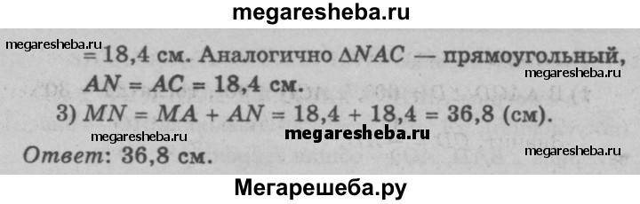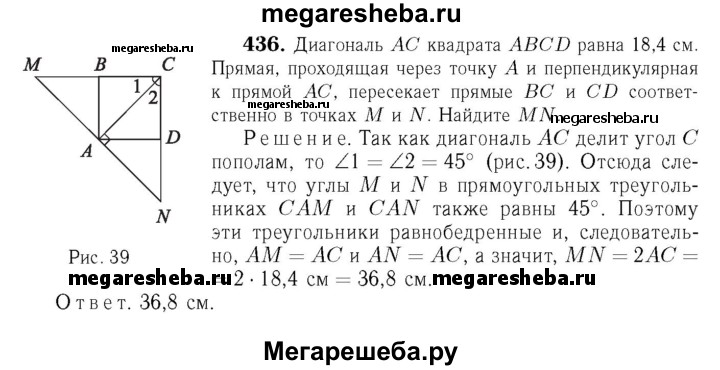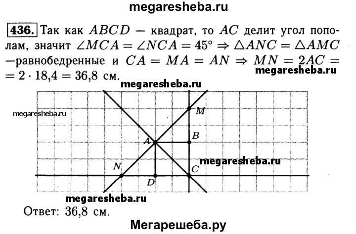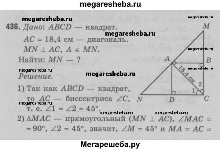 436 Диагональ АС квадрата ABCD равна 18,4 см. Прямая, проходящая через точку А и перпендикулярная к прямой АС, пересекает прямые ВС и CD соответственно в точках М и N. Найдите MN.