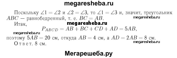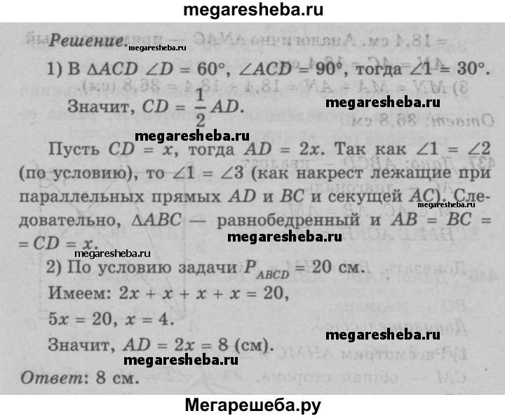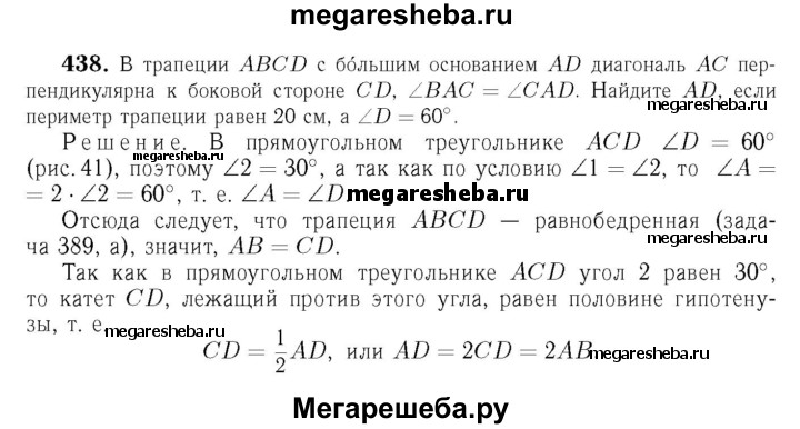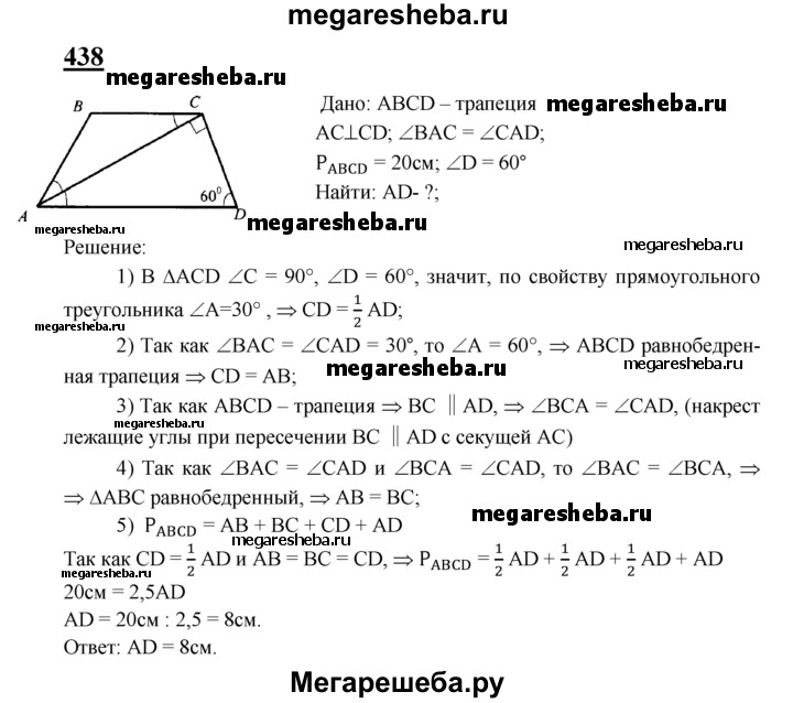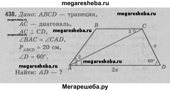 438 В трапеции ABCD с большим основанием AD диагональ АС перпендикулярна к боковой стороне CD, ZBAC = ZCAD. Найдите AD, если периметр трапеции равен 20 см, a ZD = 60°.