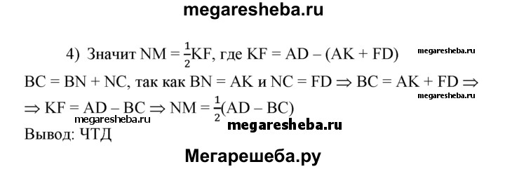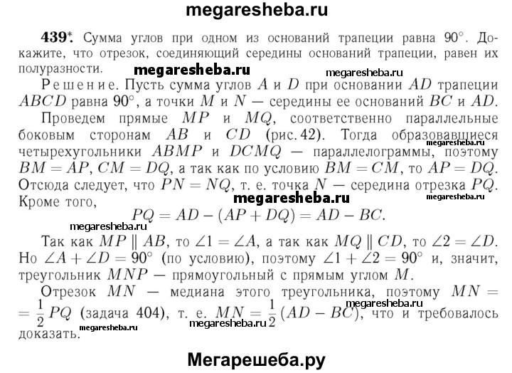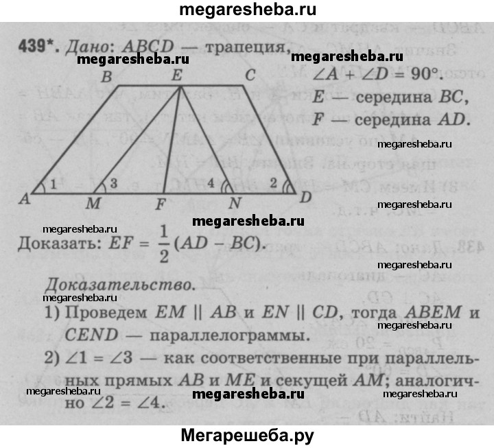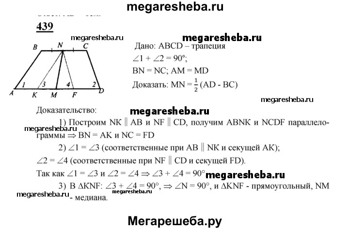 439* □ Сумма углов при одном из оснований трапеции равна 90°. Докажите, что отрезок, соединяющий середины оснований трапеции, равен их полуразности.