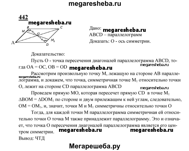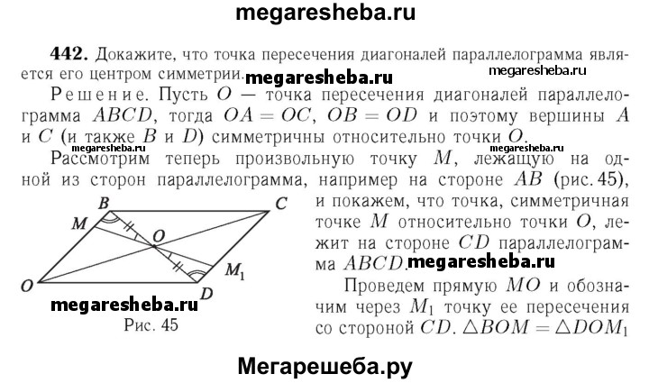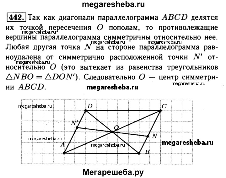 442 Докажите, что точка пересечения диагоналей параллелограмма является его центром симметрии.