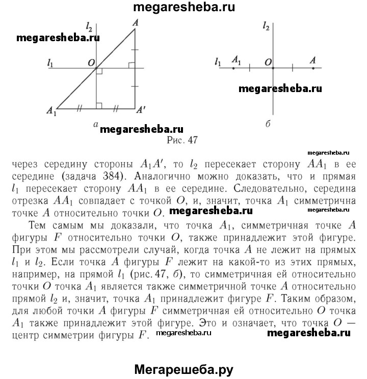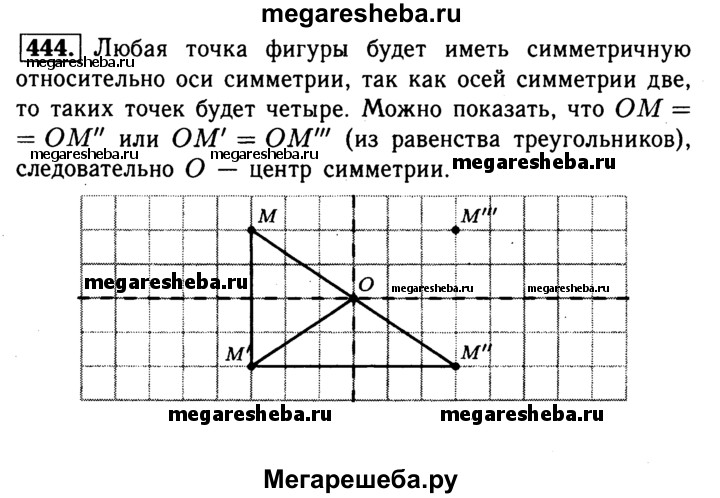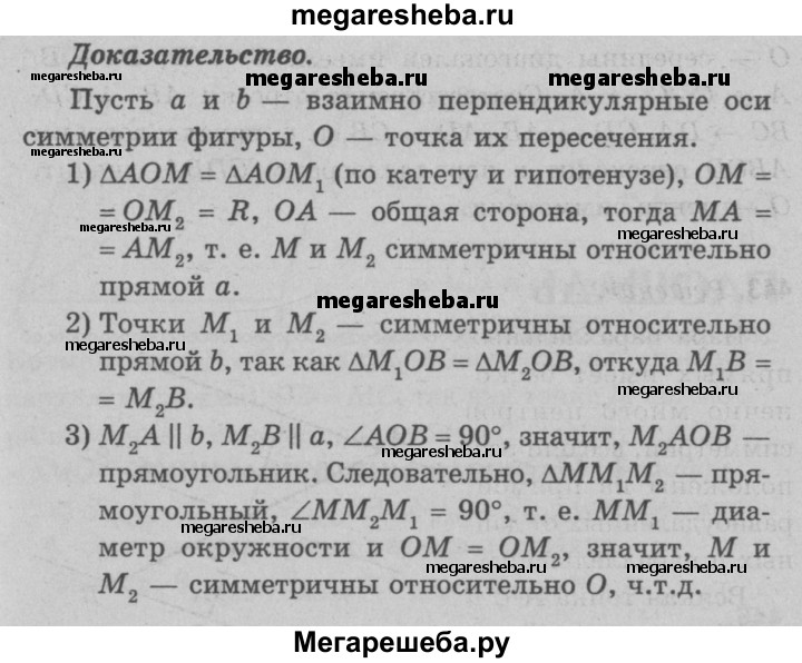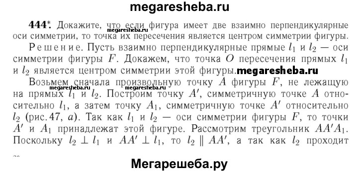 444* □ Докажите, что если фигура имеет две взаимно перпендикулярные оси симметрии, то точка их пересечения является центром симметрии фигуры.