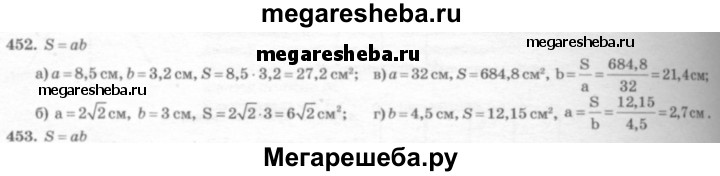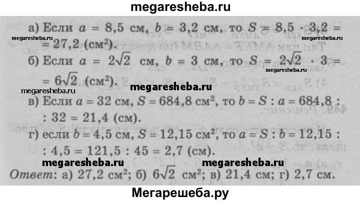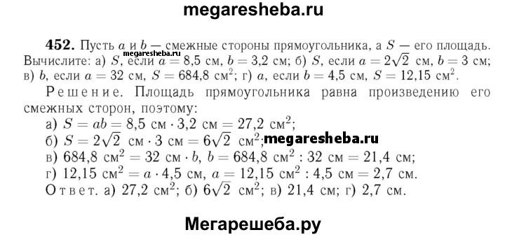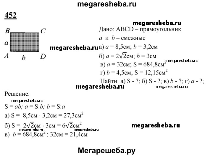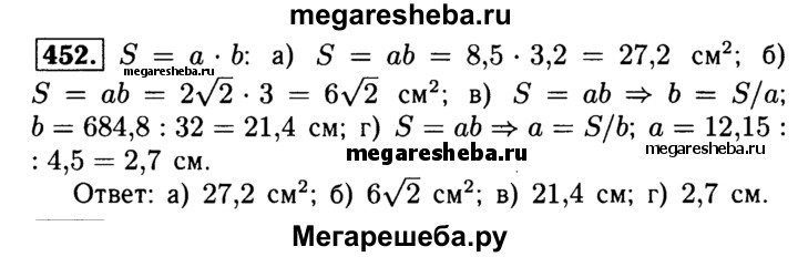 452 Пусть а и b — смежные стороны прямоугольника, a S — его площадь. Вычислите: a) S, если а = 8,5 см, b = 3,2 см; б) S, если а = 2√2 см, b = 3 см; в) Ь, если а = 32 см, S = 684,8 см2; г) а, если b = 4,5 см, S = 12,15 см2.