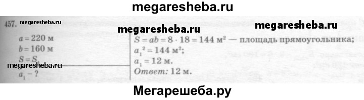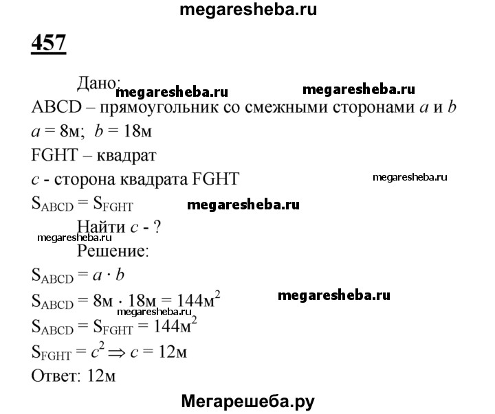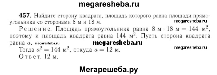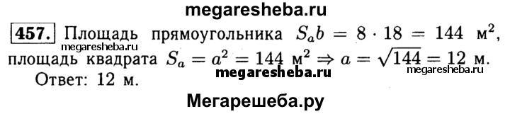 457 Найдите сторону квадрата, площадь которого равна площади прямоугольника со смежными сторонами 8 м и 18 м.