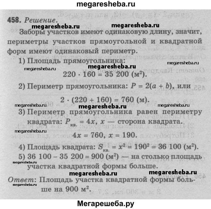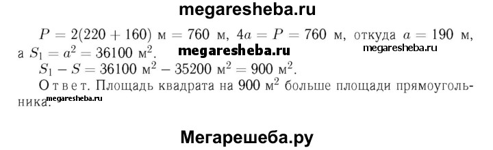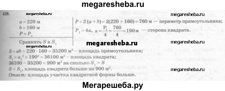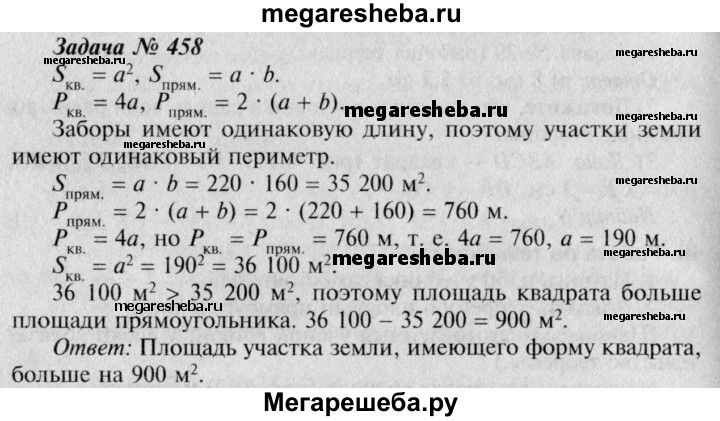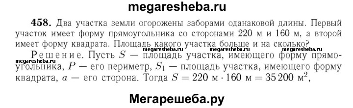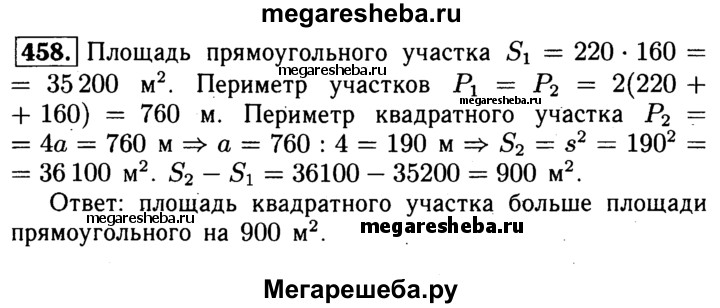 458 Два участка земли огорожены заборами одинаковой длины. Первый участок имеет форму прямоугольника со сторонами 220 м и 160 м, а второй имеет форму квадрата. Площадь какого участка больше и на сколько?