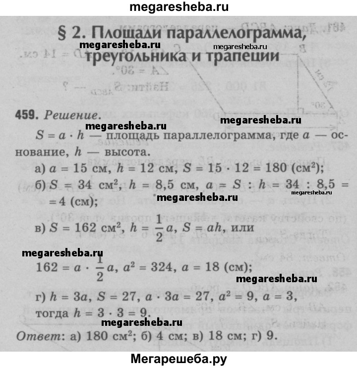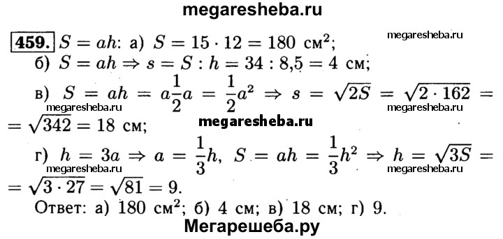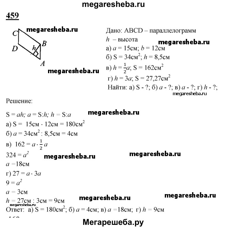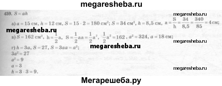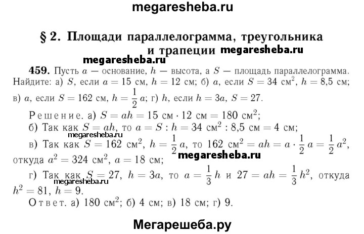 459 Пусть а — основание, h — высота, a S — площадь параллелограмма. Найдите: a) S, если а = 15 см, h = 12 см; б) а, если S = 34см2, h =8,5 cм в)а,если S = 162см2,h = ½ a,г)h,если h = 3a, S = 27