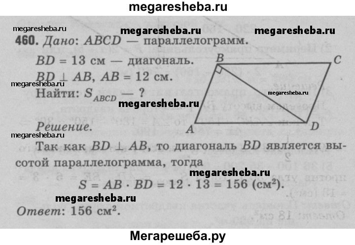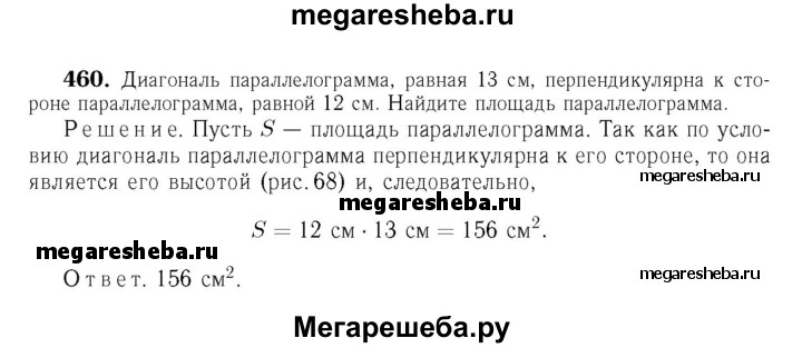 460 Диагональ параллелограмма, равная 13 см, перпендикулярна к стороне параллелограмма, равной 12см. Найдите площадь параллелограмма.