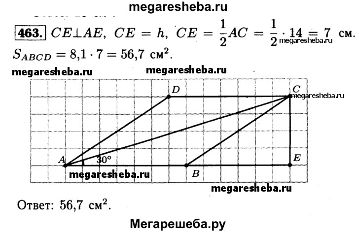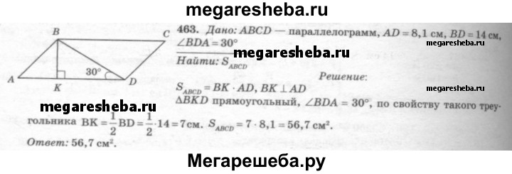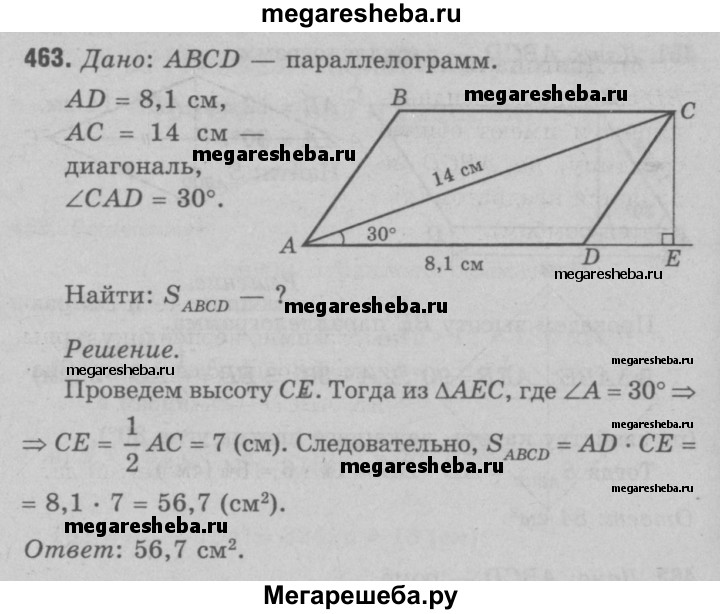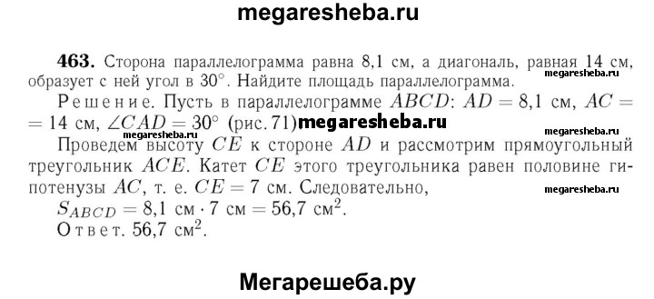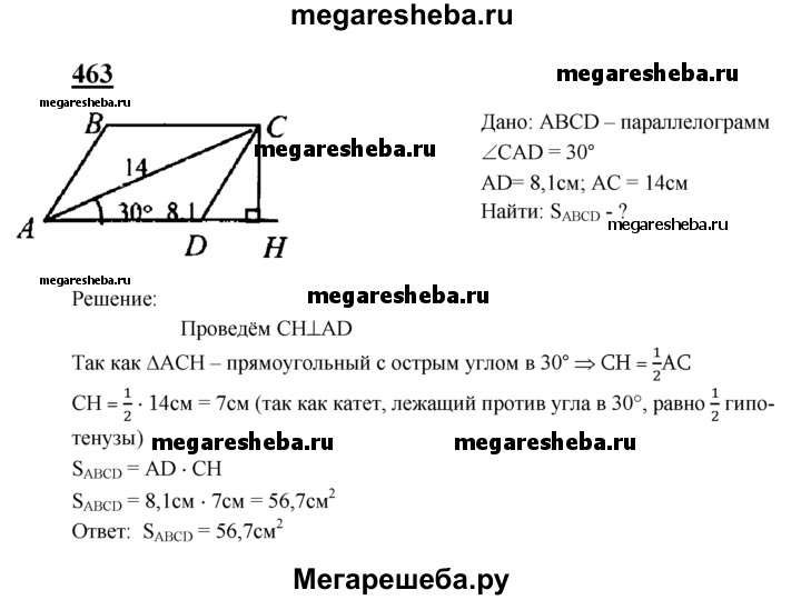 463 Сторона параллелограмма равна 8,1 см, а диагональ, равная 14 см, образует с ней угол в 30°. Найдите площадь параллелограмма.