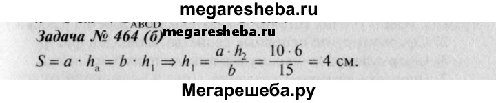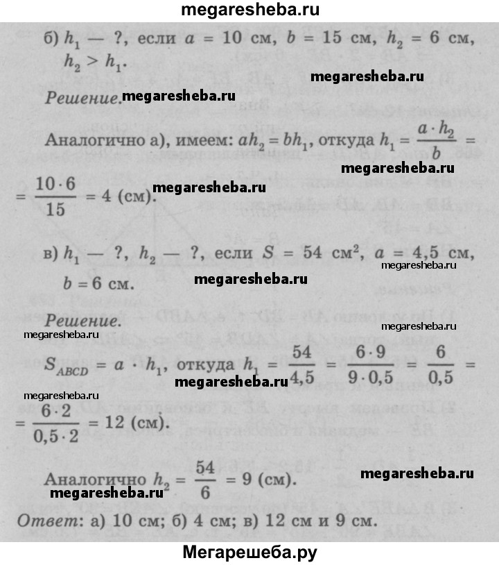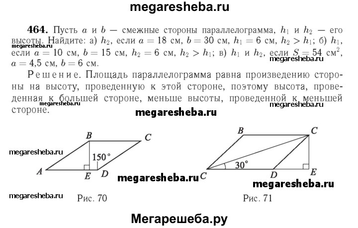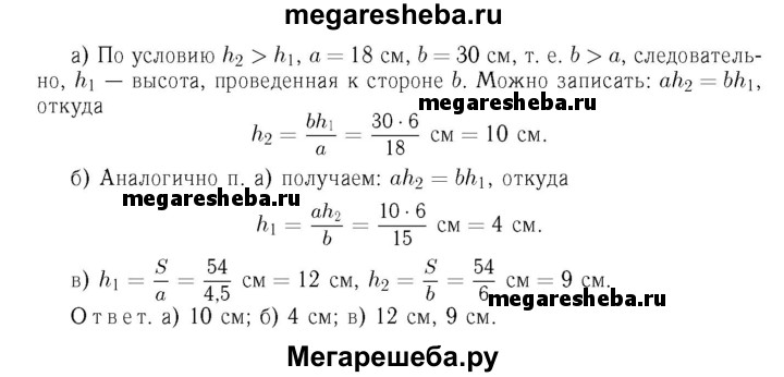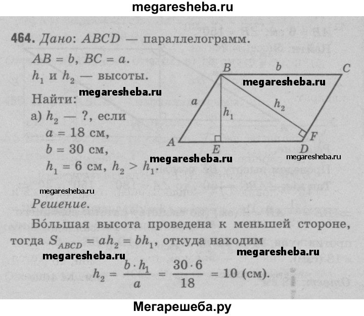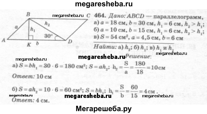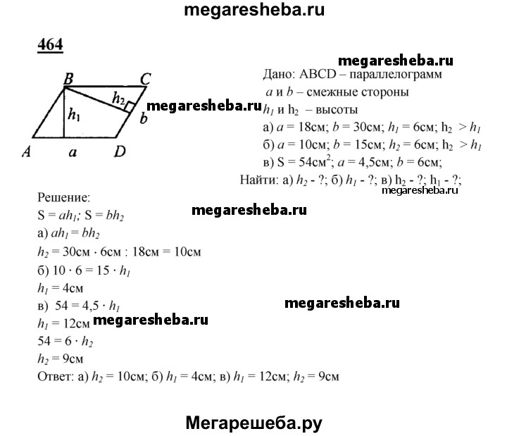 464 В Пусть а и b — смежные стороны параллелограмма, S — площадь, а h1, и h2 — его высоты. Найдите: а) h2, если а =18 см, Ь = 30см, h1 = 6 см, h2>h1; б) h1 если а = 10 см, b =15см, h2 = 6 см, h2 > h1;в) h1, и h2, если S = 54 см2, а = 4,5 см, b = 6 см.