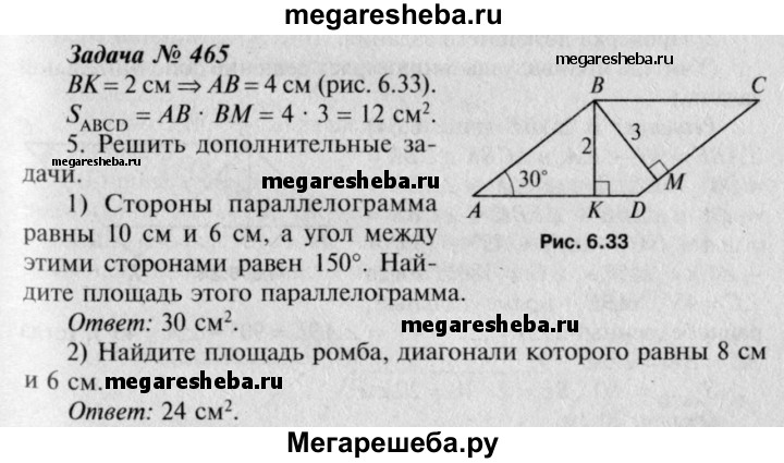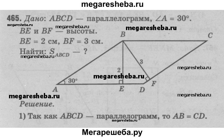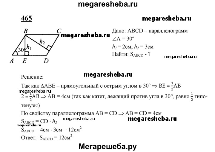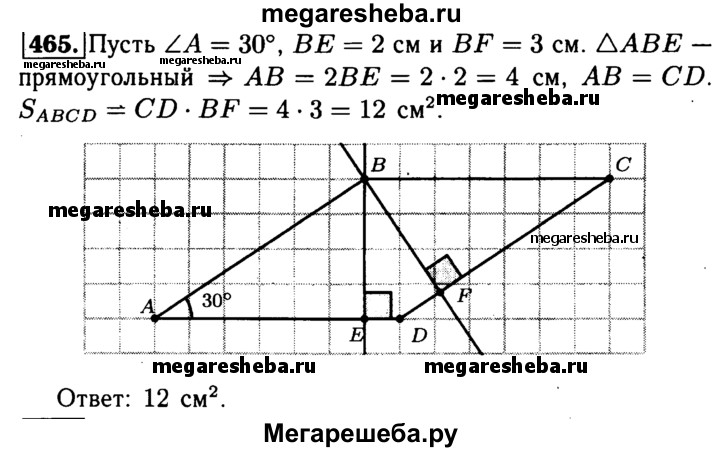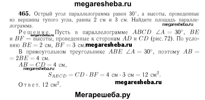 465 Острый угол параллелограмма равен 30°, а высоты, проведённые из вершины тупого угла, равны 2 см и 3 см. Найдите площадь параллелограмма.