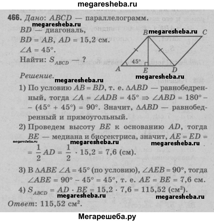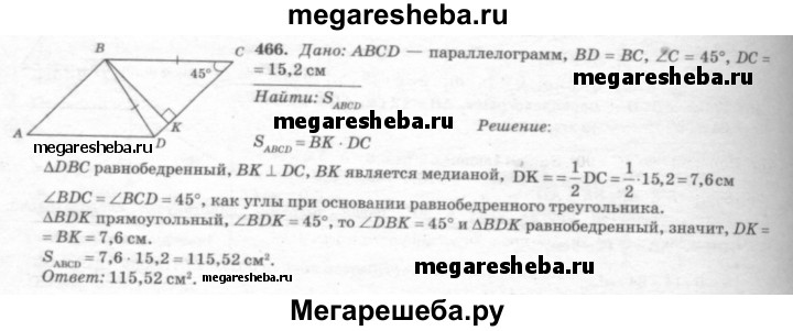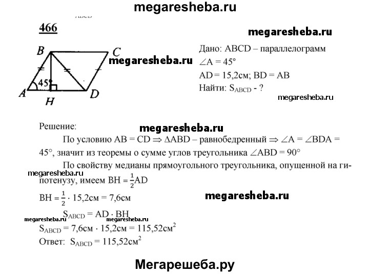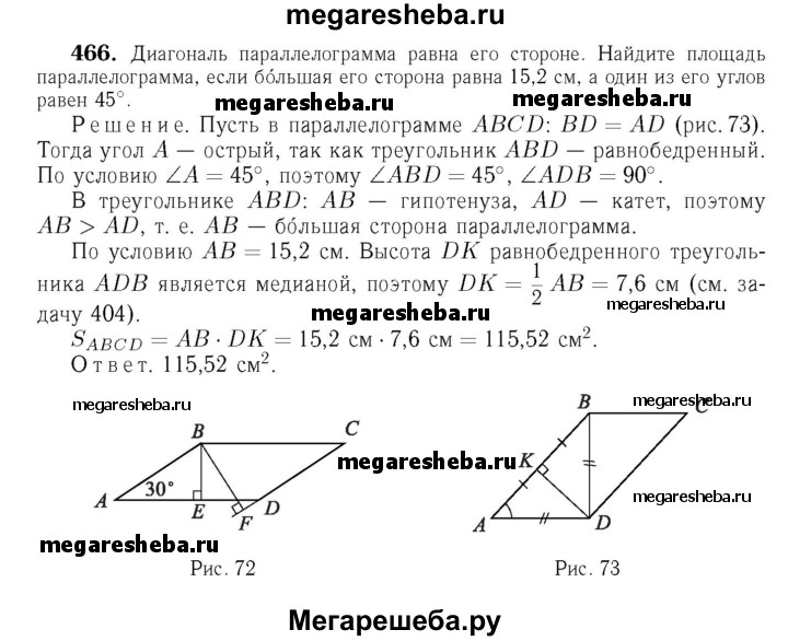 466 Диагональ параллелограмма равна его стороне. Найдите площадь параллелограмма, если большая его сторона равна 15,2 см, а один из его углов 45°.
