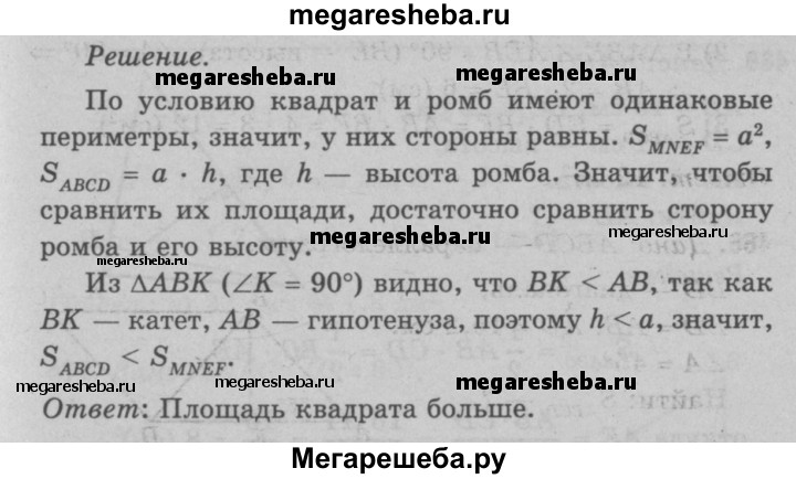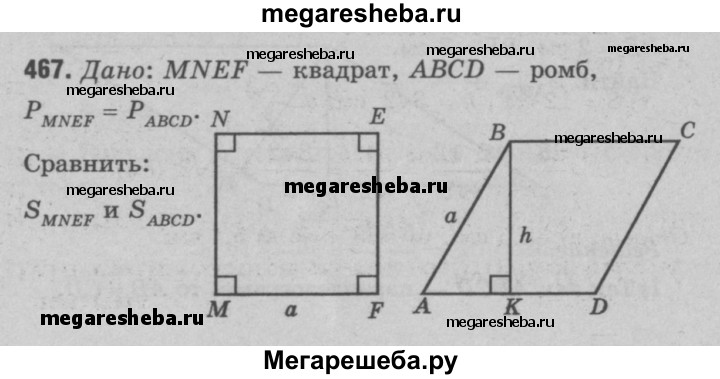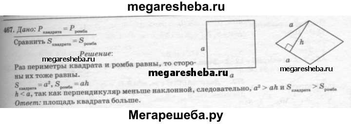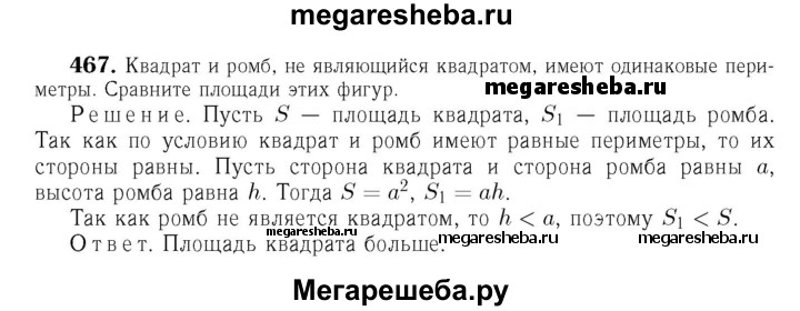 467 Квадрат и ромб, не являющийся квадратом, имеют одинаковые периметры. Сравните площади этих фигур.