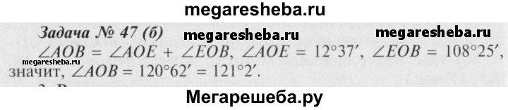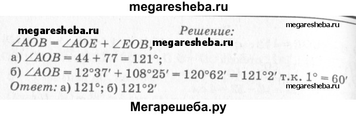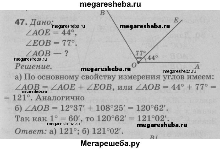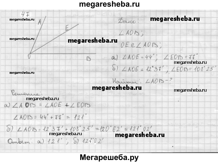 47 Луч ОЕ делит угол АОВ на два угла. Найдите ∠AOB, если: а) ∠AOE = 44°, ∠EOB = 77°; б) ∠AOE — 12°37', ∠EOB = 108°25'.