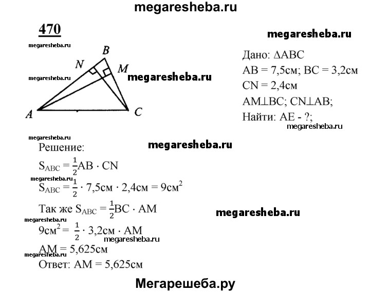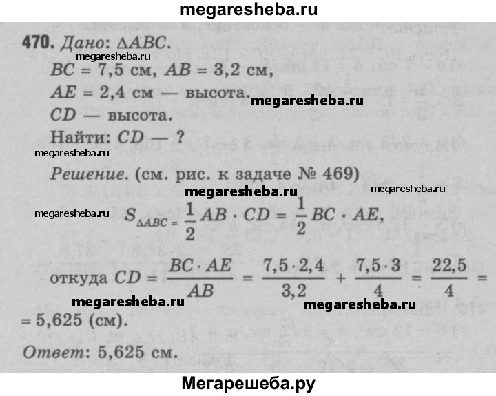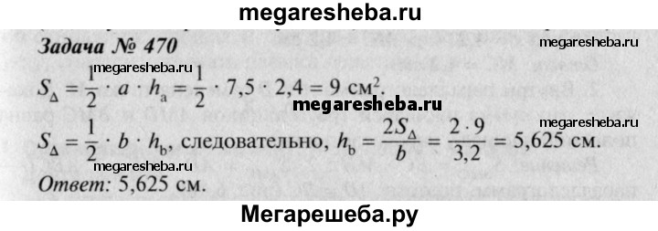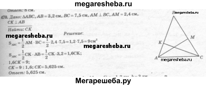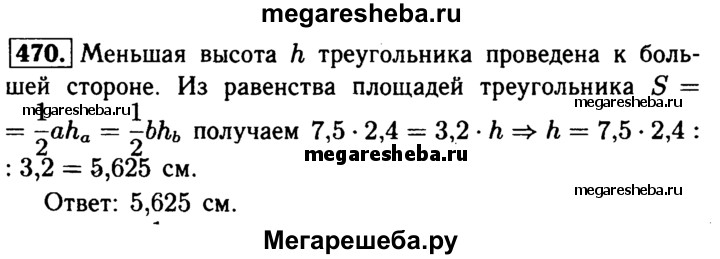 470 Две стороны треугольника равны 7,5 см и 3,2 см. Высота, проведённая к большей стороне, равна 2,4 см. Найдите высоту, проведённую к меньшей из данных сторон.