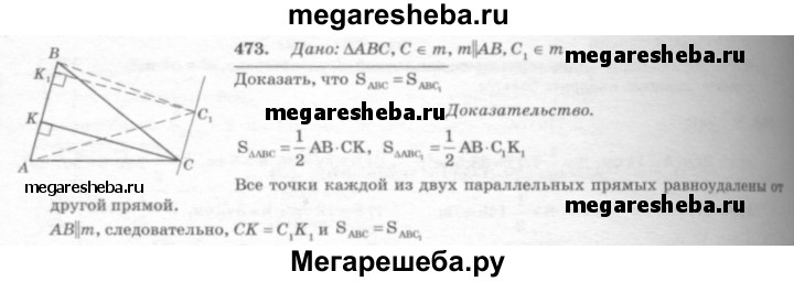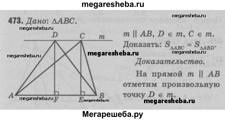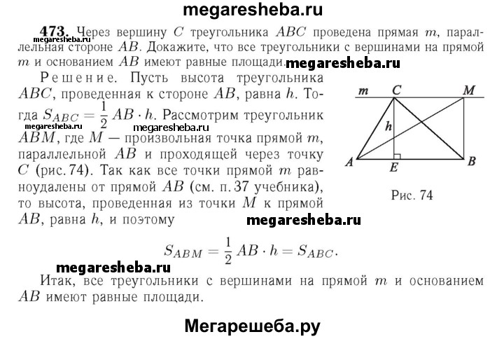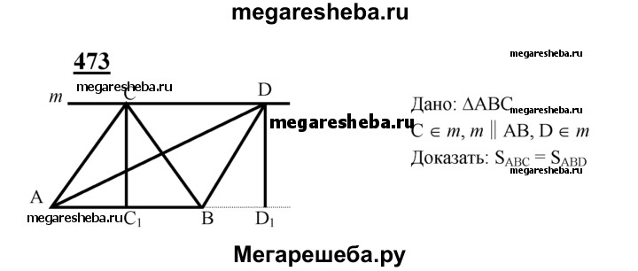 473 Через вершину С треугольника ABC проведена прямая т, параллельная стороне АВ. Докажите, что все треугольники с вершинами на прямой т и основанием АВ имеют равные площади.