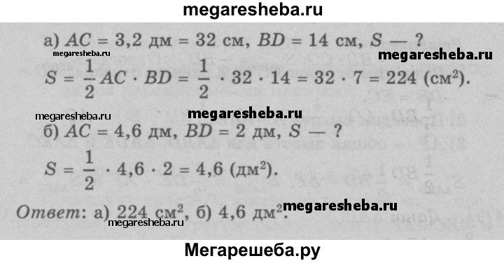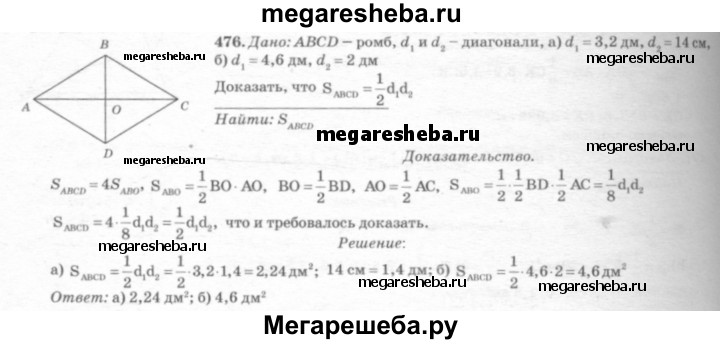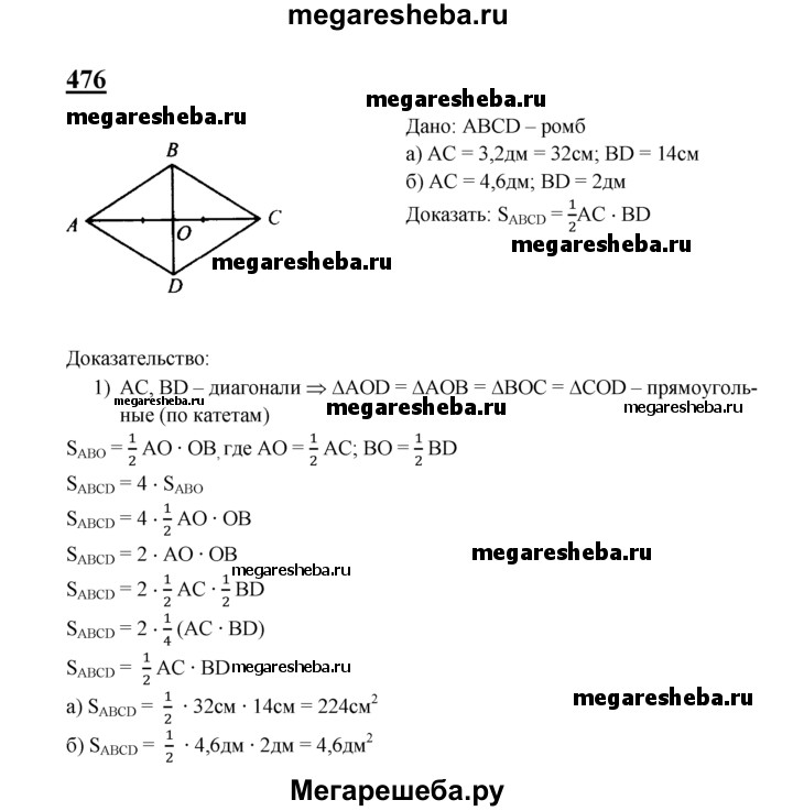 476 Докажите, что площадь ромба равна половине произведения его диагоналей. Вычислите площадь ромба, если его диагонали равны: а) 3,2 дм и 14 см; б) 4,6 дм и 2 дм.