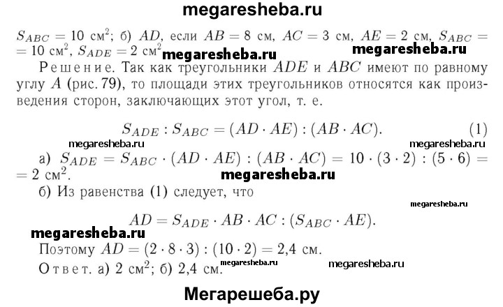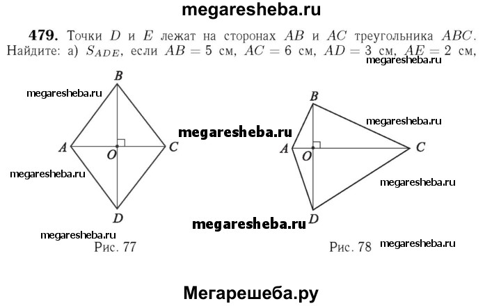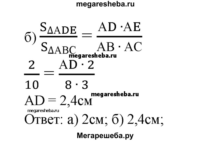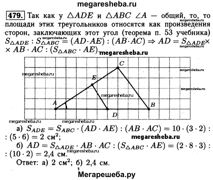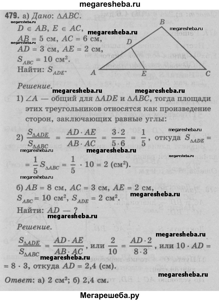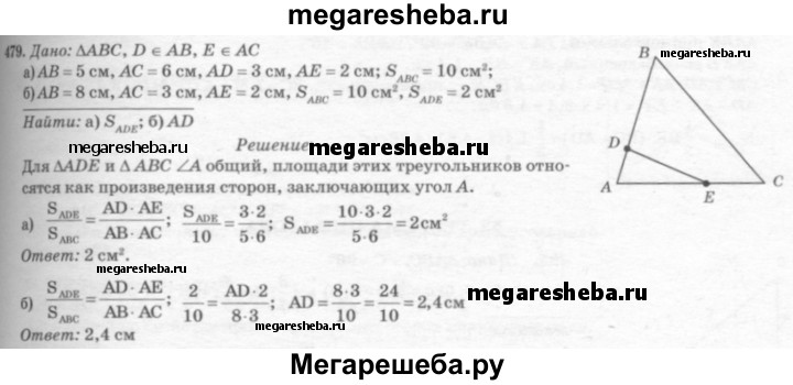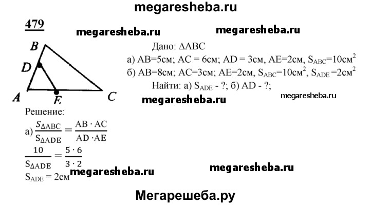 479 Точки D и Е лежат на сторонах АВ и АС треугольника ABC. Найдите: a) SADE, если АВ = 5 см, АС = 6 см, AD = 3см, АЕ = 2 см, Sabc=10cm2; б) AD, если АВ = 8 см, АС = 3см, АЕ = 2 см, SABC = 10 см2, SADE = 2 см2.