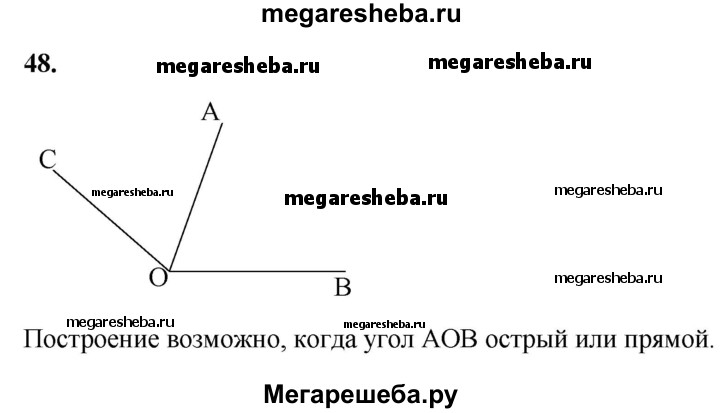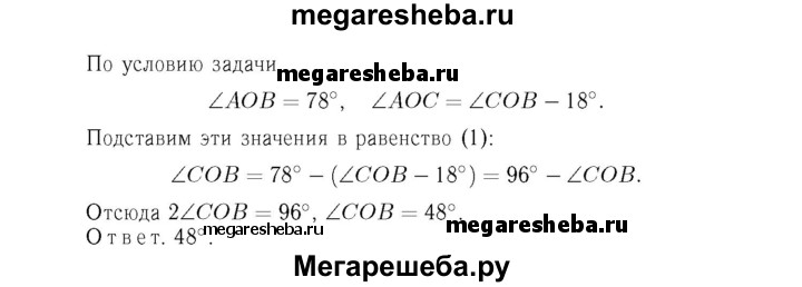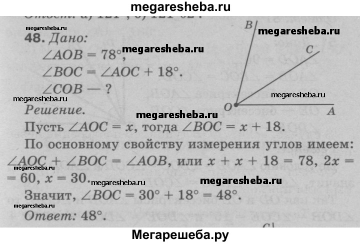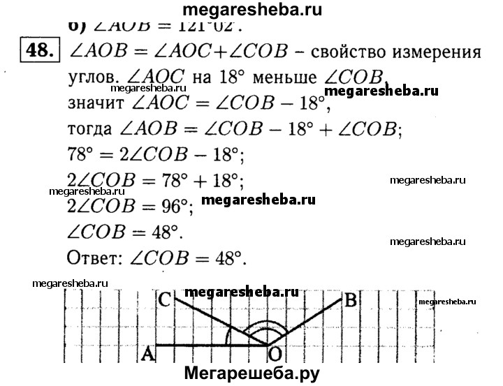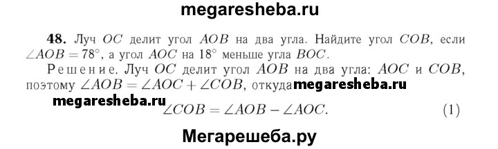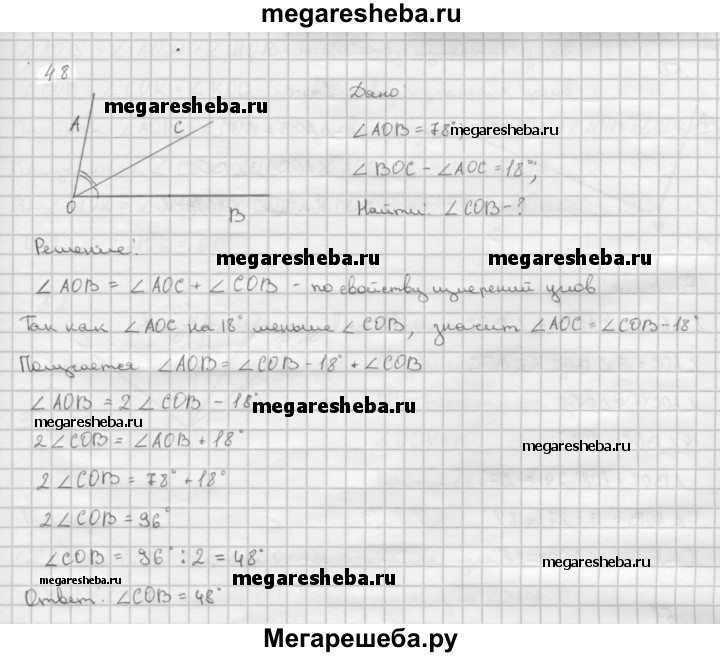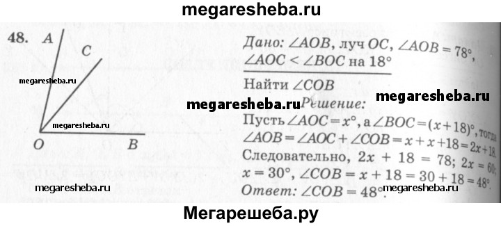 48 Луч ОС делит угол АОВ на два угла. Найдите угол СОВ, если ∠AOB — 78°, а угол АОС на 18° меньше угла ВОС.