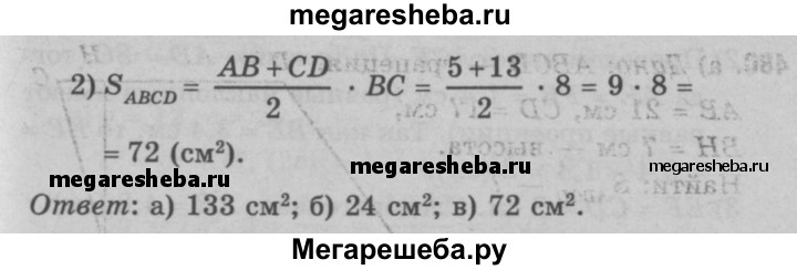 480 Найдите площадь трапеции ABCD с основаниями АВ и CD, если: а) АВ = 21 см, CD =17 см, высота ВН равна 7 см; б) ZD = 30°, АВ = 2 см, CD = 10 см, DA = 8 см; в) ВС 1 АВ, АВ = 5 см, ВС = 8 см, CD = 13 см.