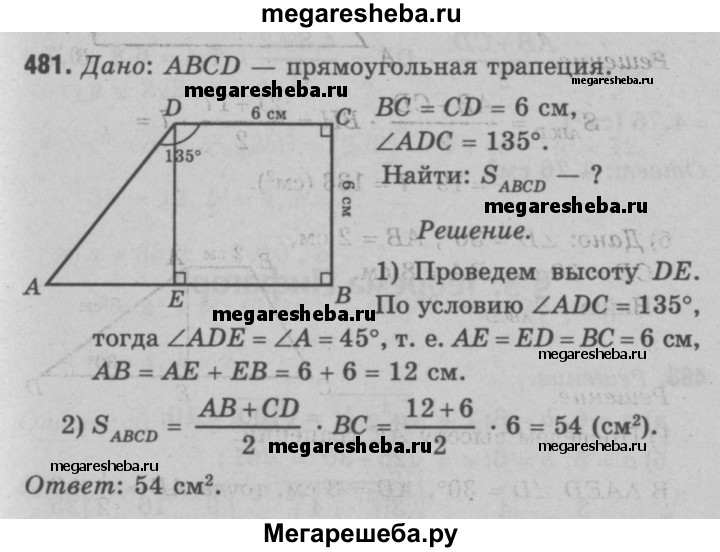 481 Найдите площадь прямоугольной трапеции, у которой две меньшие стороны равны 6 см, а больший угол равен 135°. Тупой угол равнобедренной трапеции равен 135°, а высота, проведённая из вершины этого угла, делит большее основание на отрезки 1,4 см и 3,4 см. Найдите площадь трапеции.