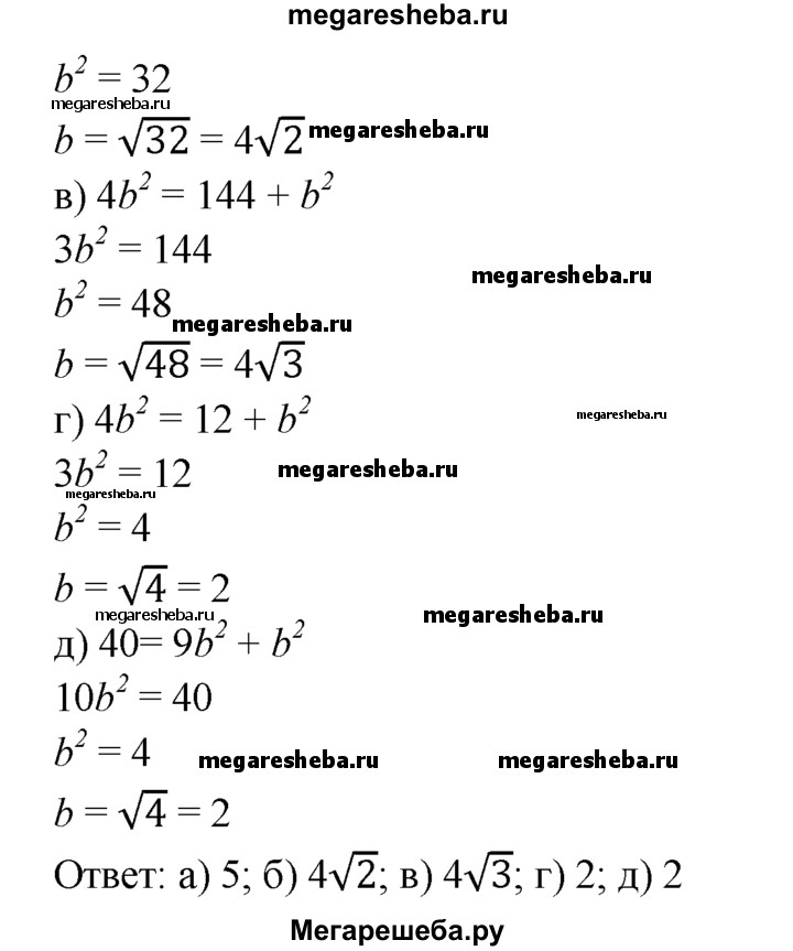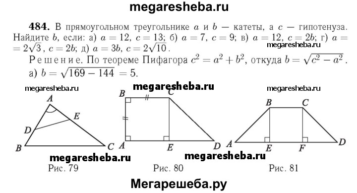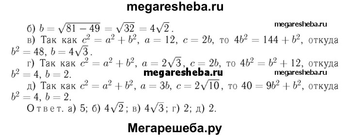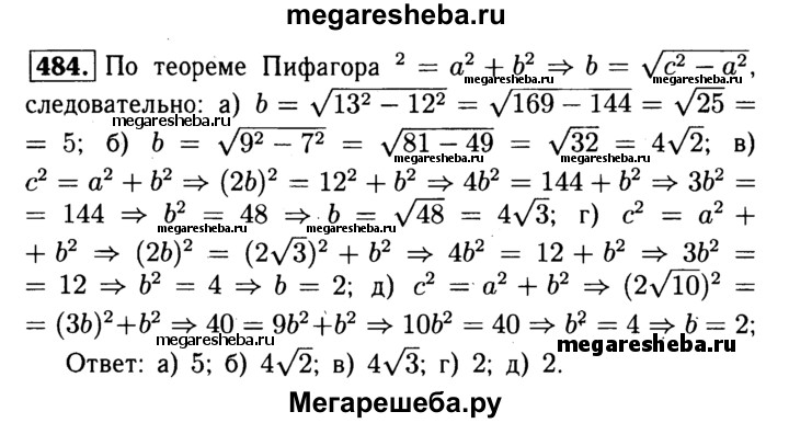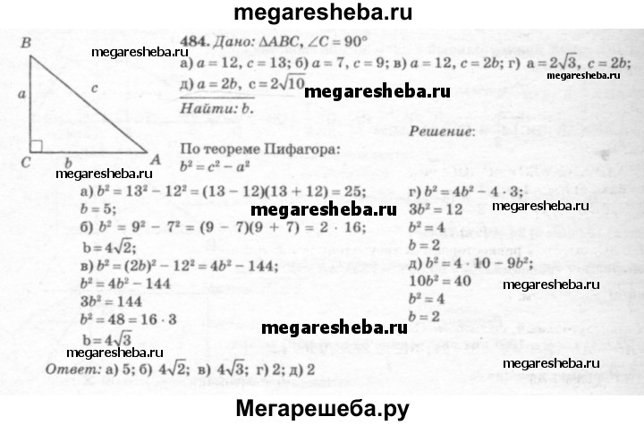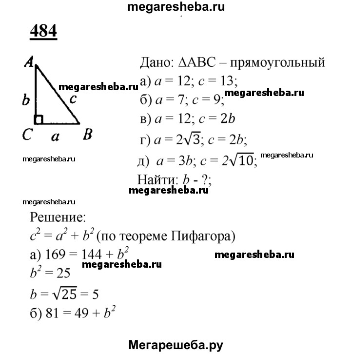 484 В прямоугольном треугольнике а и b — катеты, с — гипотенуза. Найдите 6, если: а) а = 12, с = 13; б) а = 7, с = 9; в) а = 12, с = 2b; г) а = 2√3, с = 2b; д) а = 36, с = 2√10.