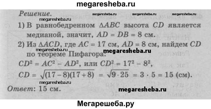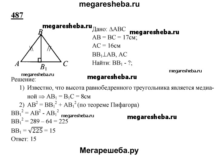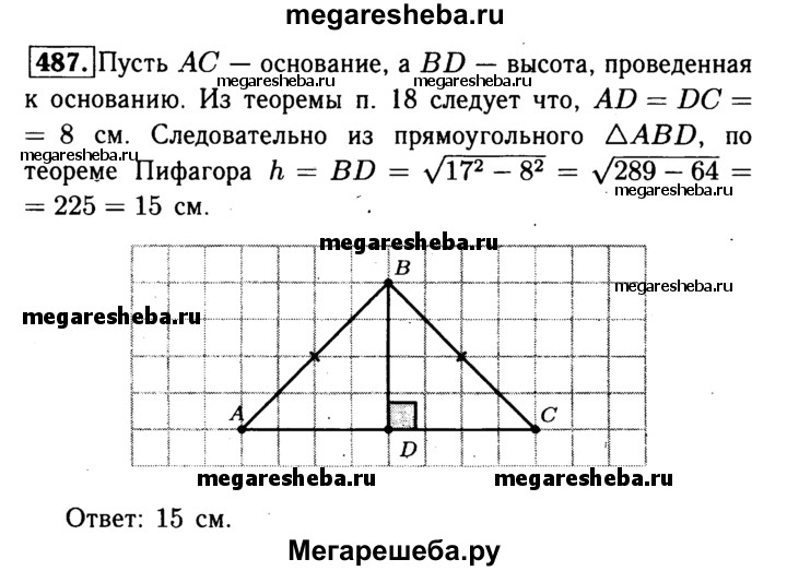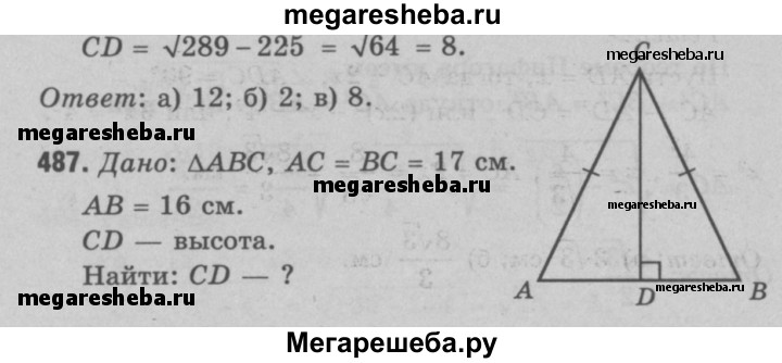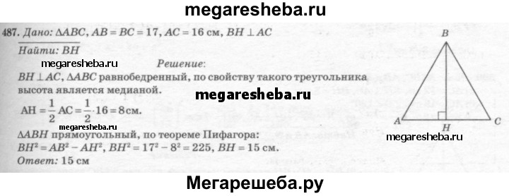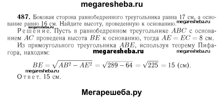 487 Боковая сторона равнобедренного треугольника равна 17 см, а основание равно 16 см. Найдите высоту, проведённую к основанию.