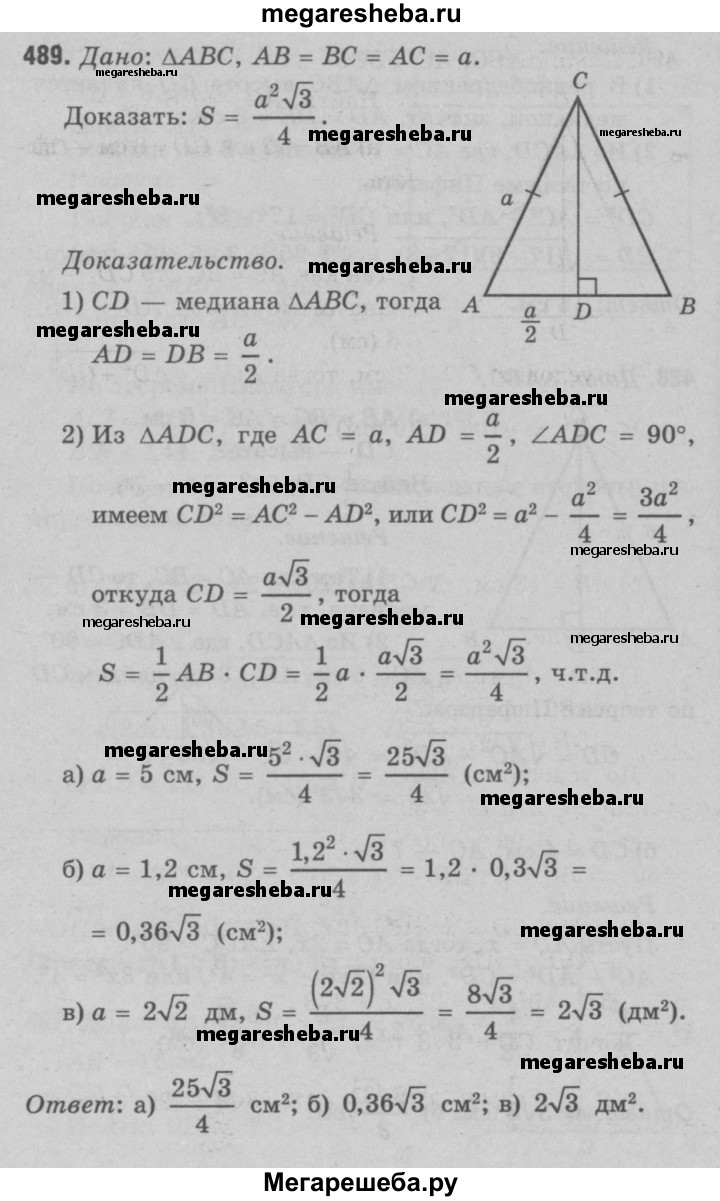 489 Докажите, что площадь равностороннего треугольника вычисляется по формуле S =a2√3/4, где a — сторона треугольника. Найдите площадь равностороннего треугольника, если его сторона равна: а) 5 см; б) 1,2 см; в) 2√2 дм.