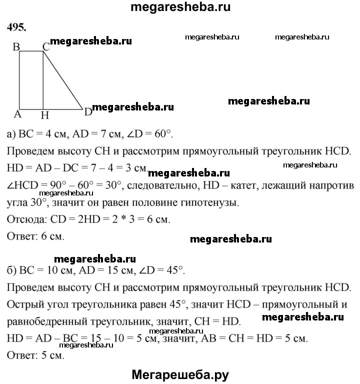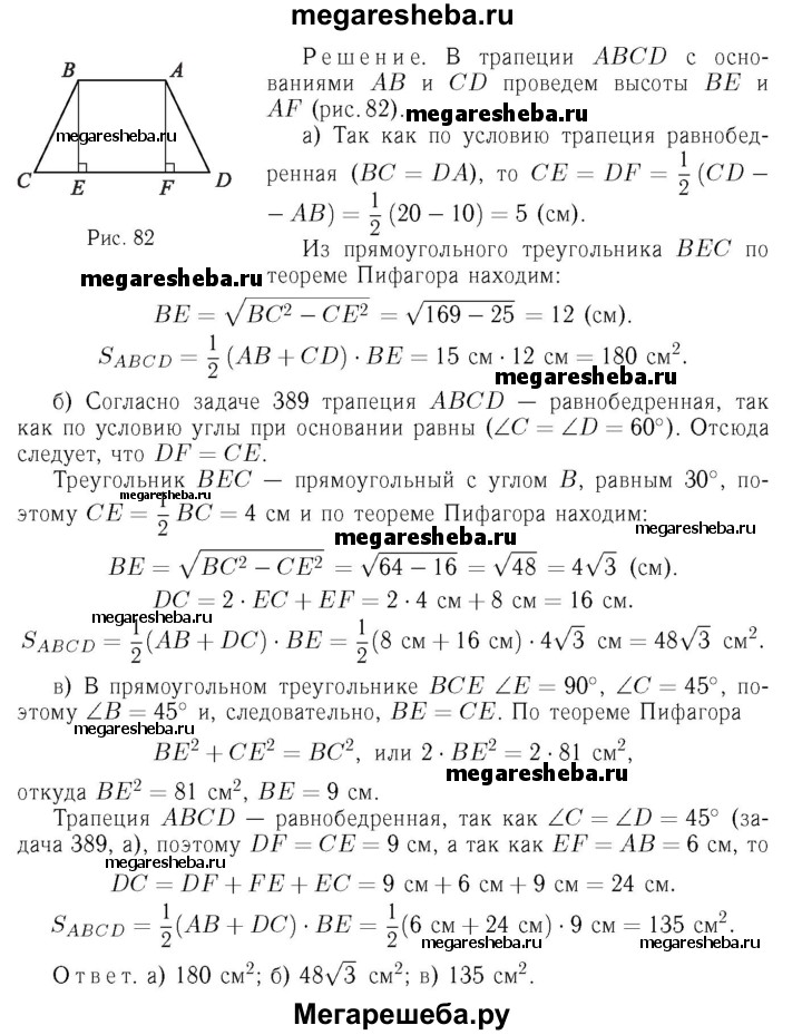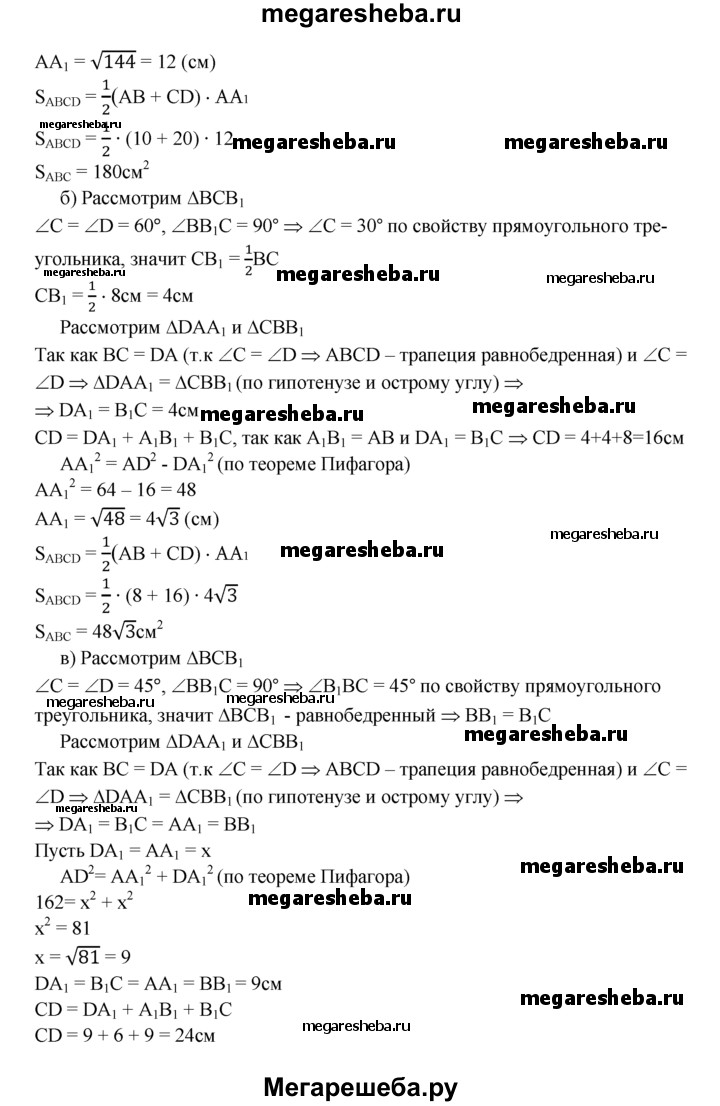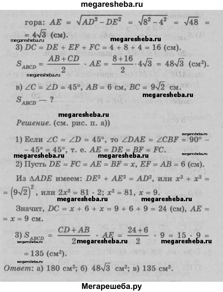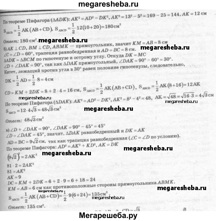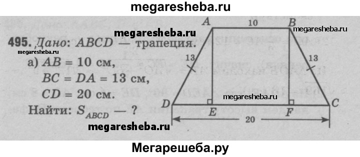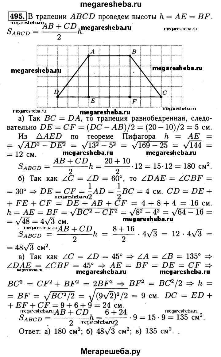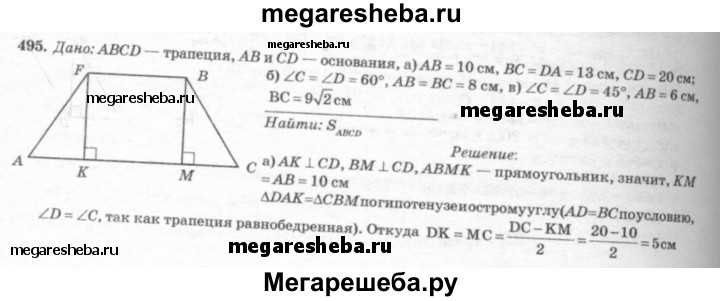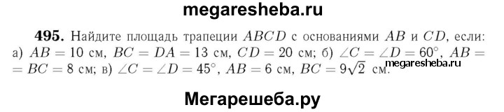 495 Найдите площадь трапеции ABCD с основаниями АВ и CD, если: а) АВ = 10см, BC = DA = 13 см, CD = 20 см; б) ∠C=∠D=60°, АВ = ВС = 8 см; в) ∠C = ∠D = 45°, АВ = 6 см, ВС = 9√2 см.