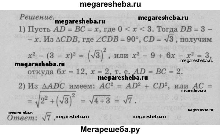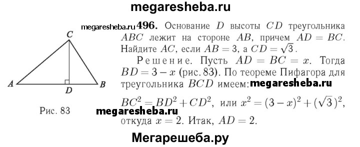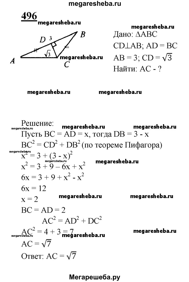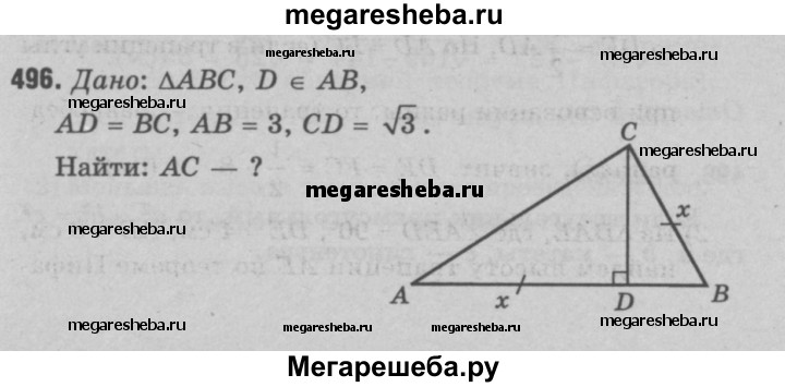 496 Основание D высоты CD треугольника ABC лежит на стороне АВ, причём AD = ВС. Найдите АС, если АВ = 3, a CD = √3.