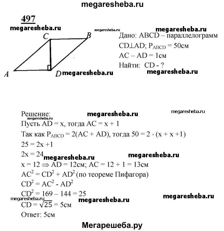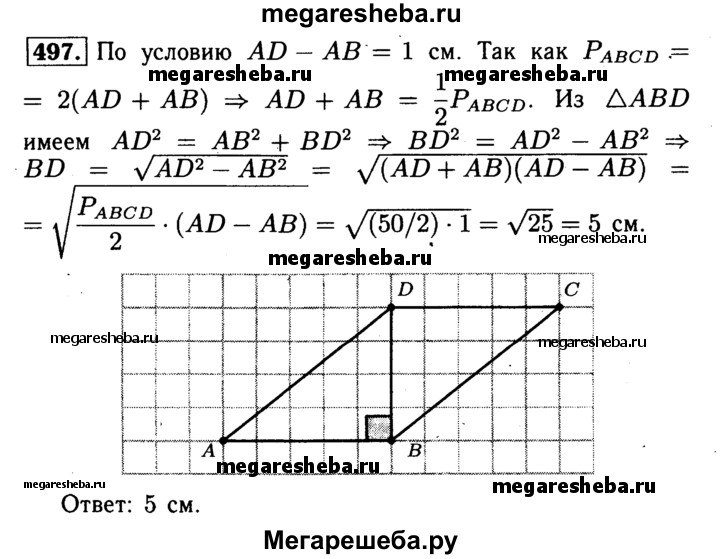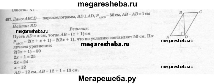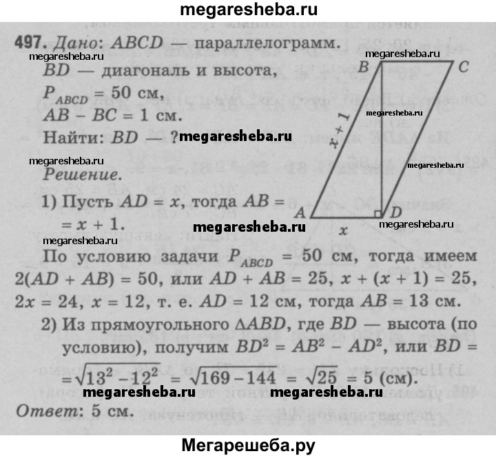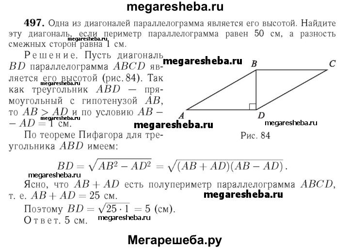 497 Одна из диагоналей параллелограмма является его высотой. Найдите эту диагональ, если периметр параллелограмма равен 50 см, а разность смежных сторон равна 1 см.