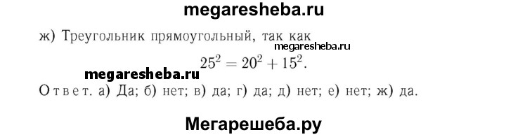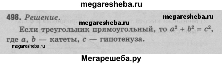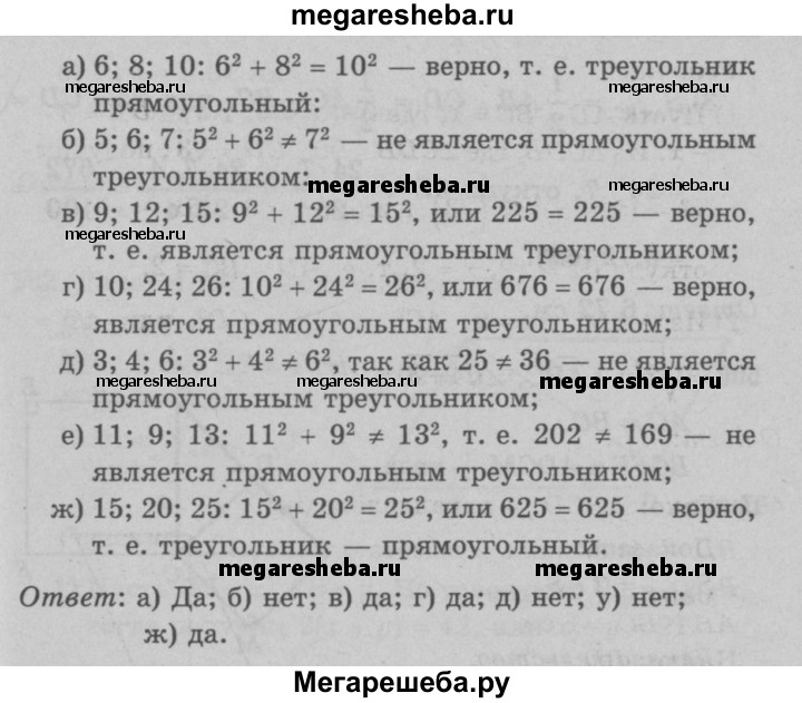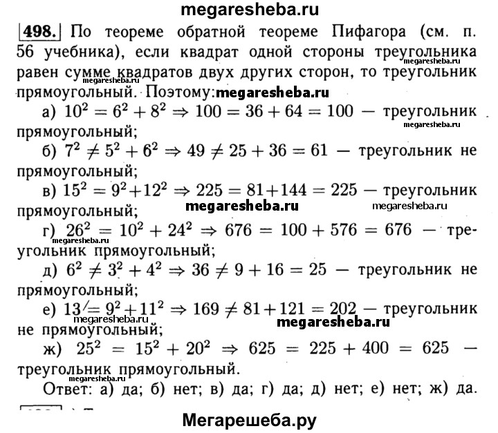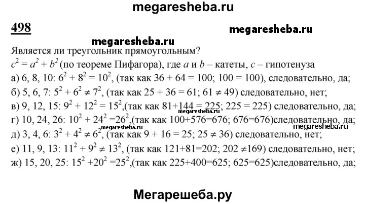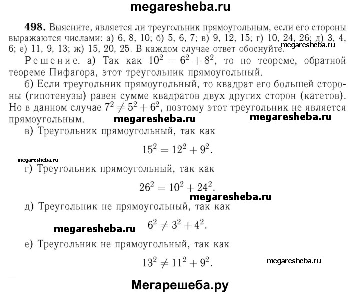 498 Выясните, является ли треугольник прямоугольным, если его стороны выражаются числами: а) 6, 8, 10; б) 5, 6, 7; в) 9, 12, 15; г) 10, 24, 26; д) 3, 4, 6; е) 11, 9, 13; ж) 15, 20, 25. В каждом случае ответ обоснуйте.