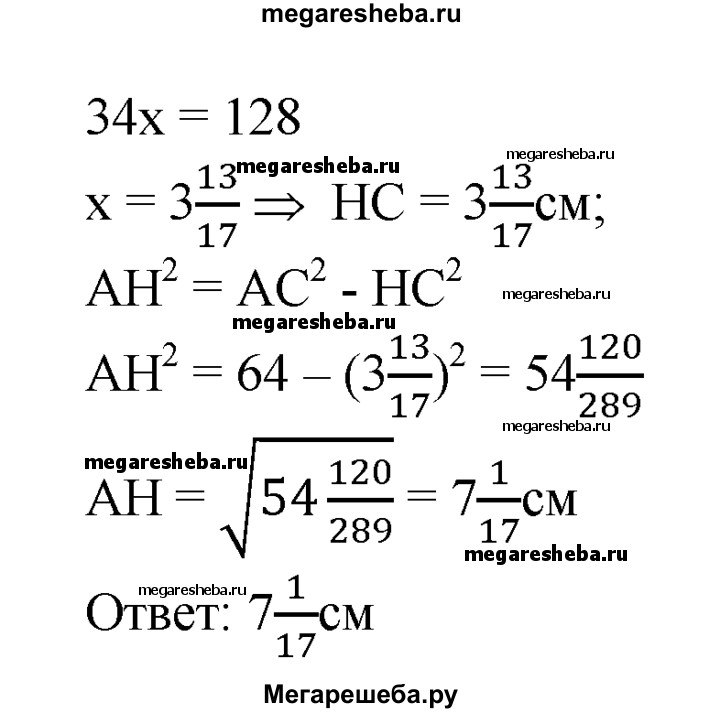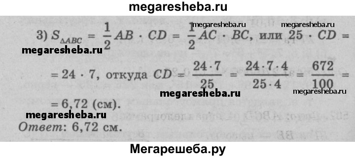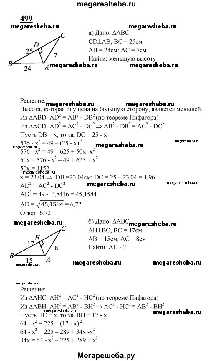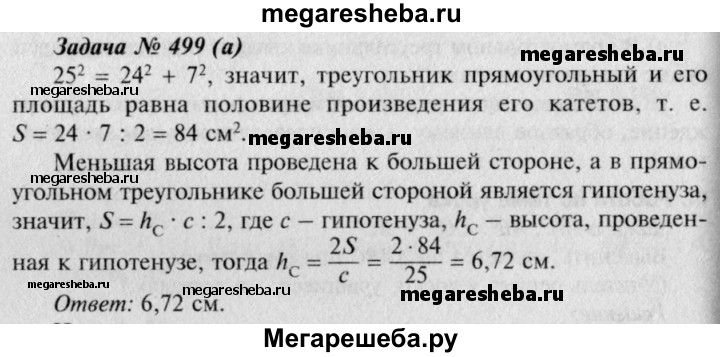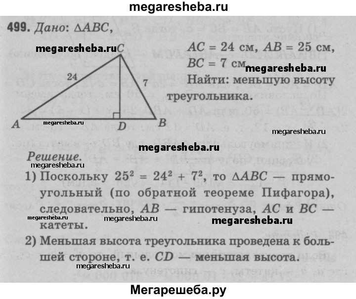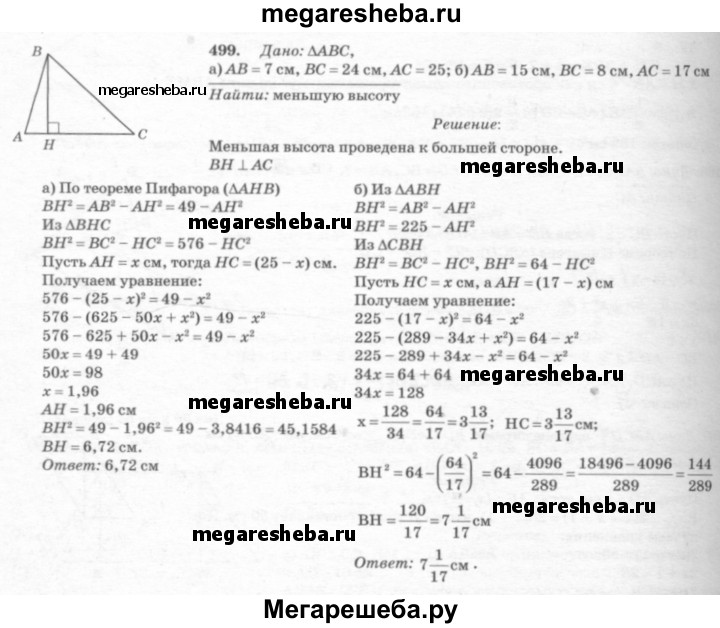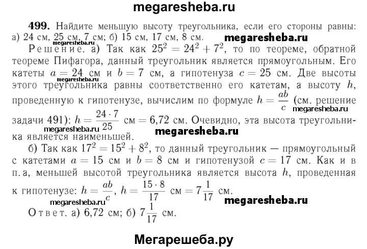 499 Найдите меньшую высоту треугольника со сторонами, равными: а) 24 см, 25 см, 7 см; б) 15 см, 17 см, 8 см.