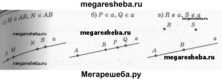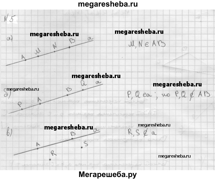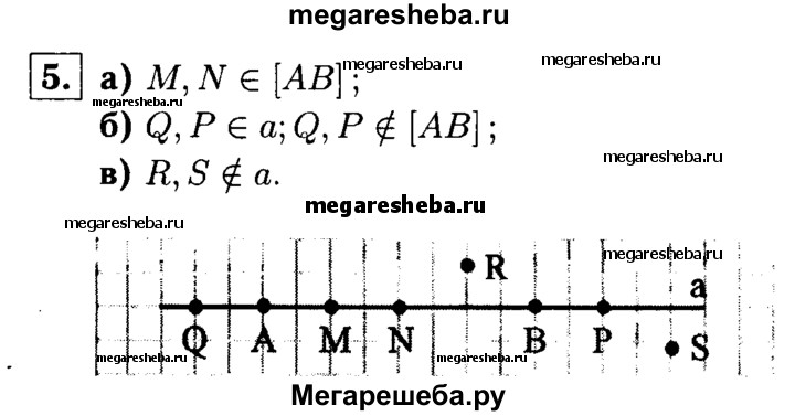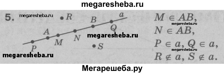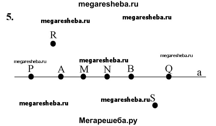 5 Проведите прямую а и отметьте на ней точки А и B. Отметьте: а) точки М и N, лежащие на отрезке АВ; б) точки Р и Q, лежащие на прямой а, но не лежащие на отрезке АВ; в) точки R и S, не лежащие на прямой а.