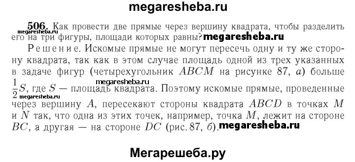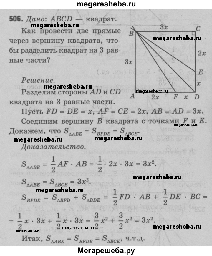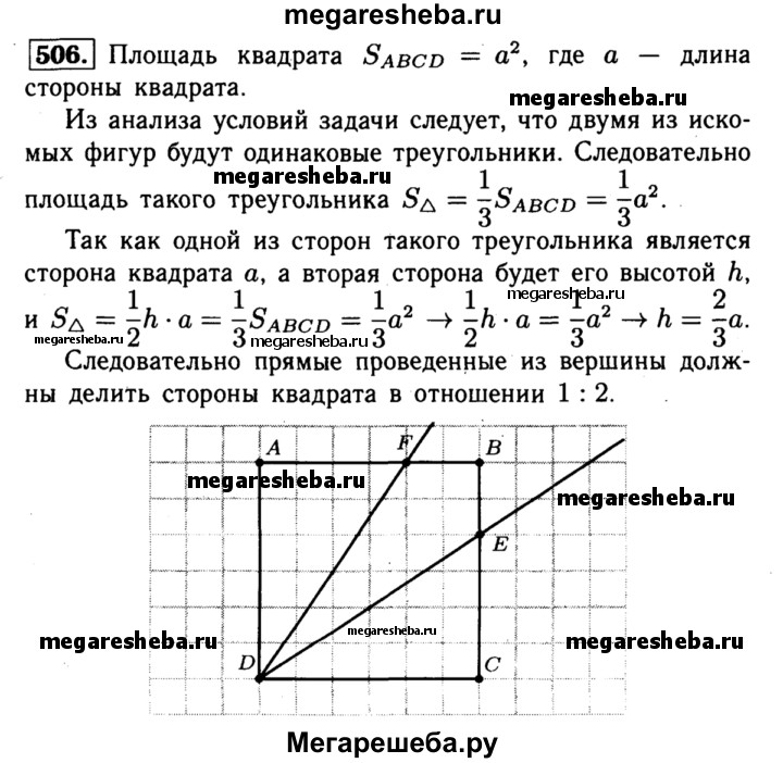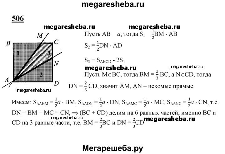 506 Как провести две прямые через вершину квадрата, чтобы разделить его на три фигуры, площади которых равны?