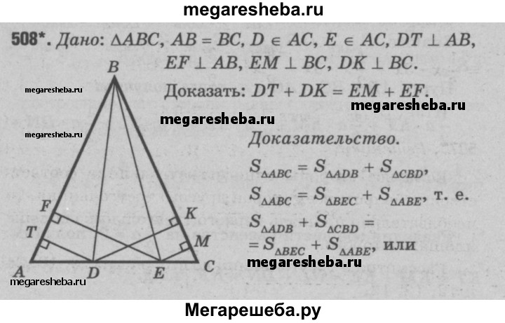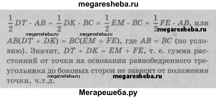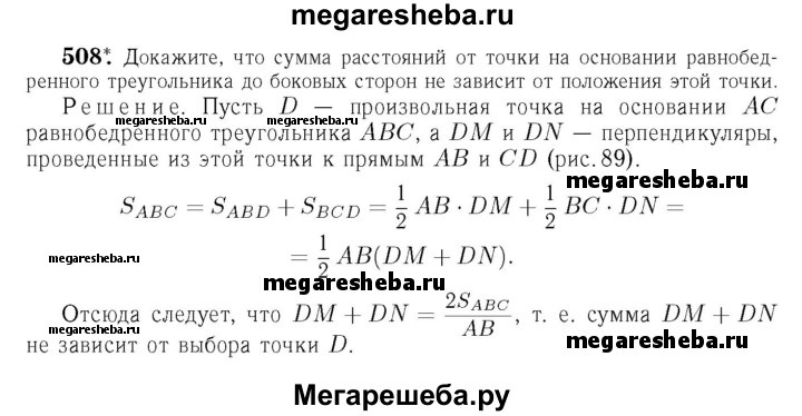 508 Докажите, что сумма расстояний от точки на основании равнобедренного треугольника до боковых сторон не зависит от положения этой точки.