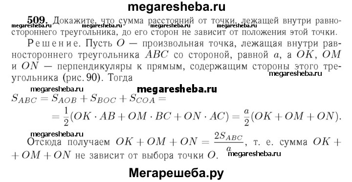 509 Докажите, что сумма расстояний от точки, лежащей внутри равностороннего треугольника, до его сторон не зависит от положения этой точки.