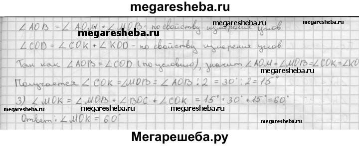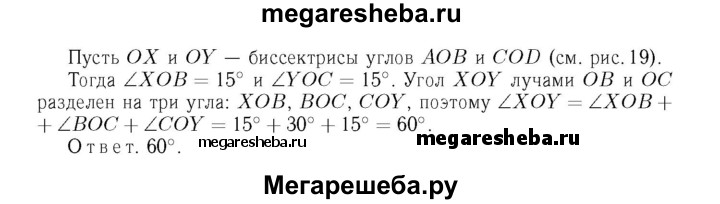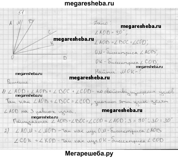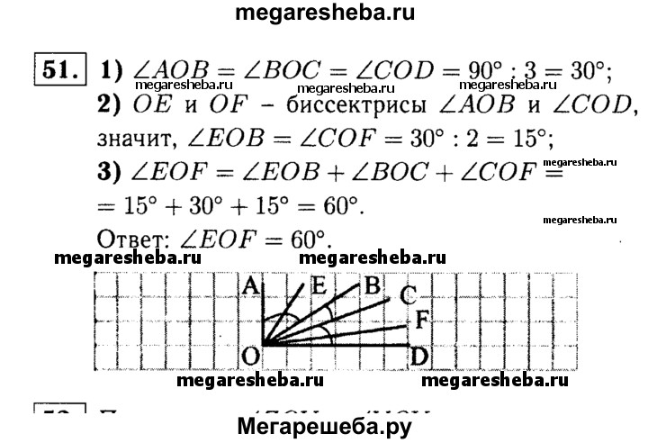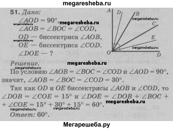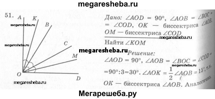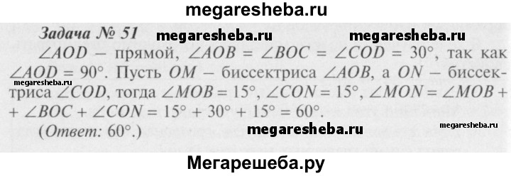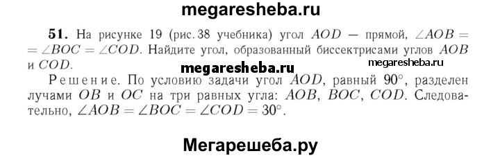 51 На рисунке 38 угол AOD — прямой, ∠AOB — ZBOC = ∠COD. Найдите угол, образованный биссектрисами углов АОВ и COD.