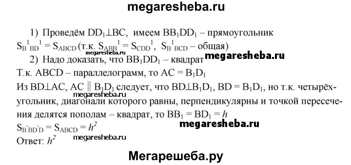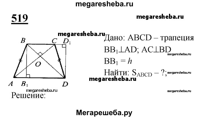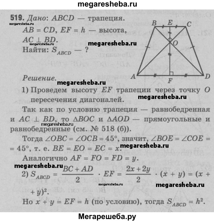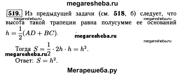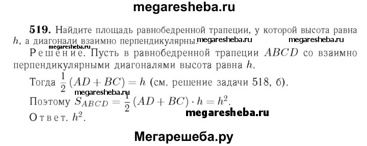 519 Найдите площадь равнобедренной трапеции, у которой высота равна h, а диагонали взаимно перпендикулярны.