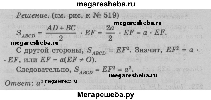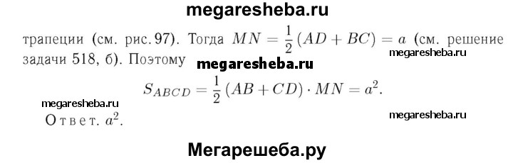 520 Диагонали равнобедренной трапеции взаимно перпендикулярны, а сумма оснований равна 2а. Найдите площадь трапеции.