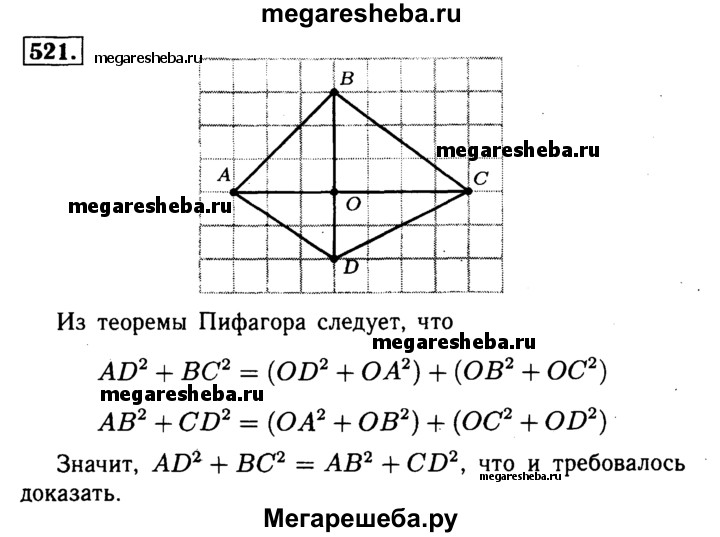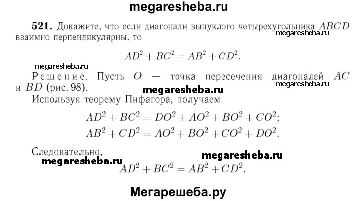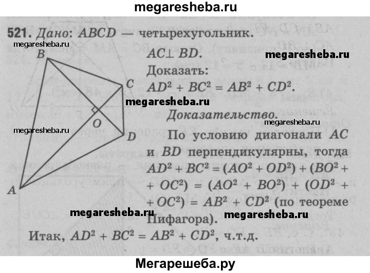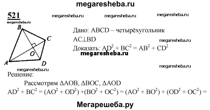 521 Докажите, что если диагонали четырёхугольника ABCD взаимно перпендикулярны, то AD2 + ВС2 = АВ2 + CD2.