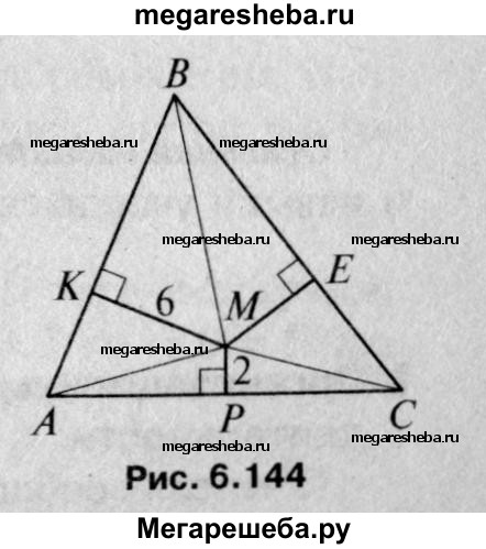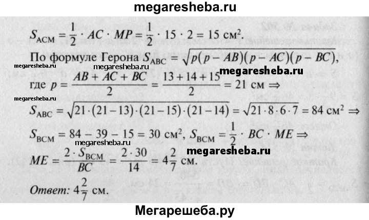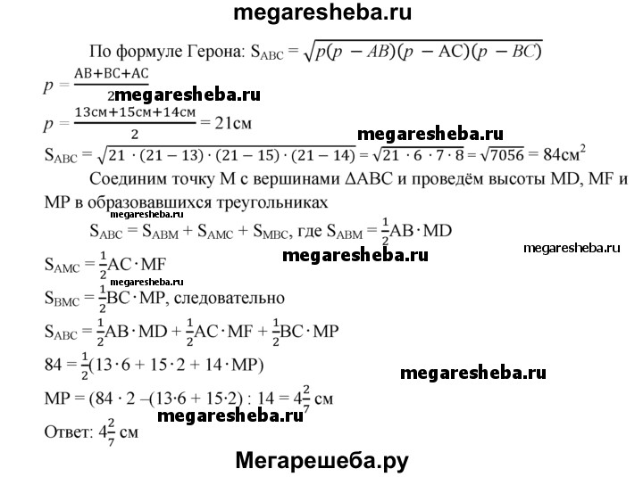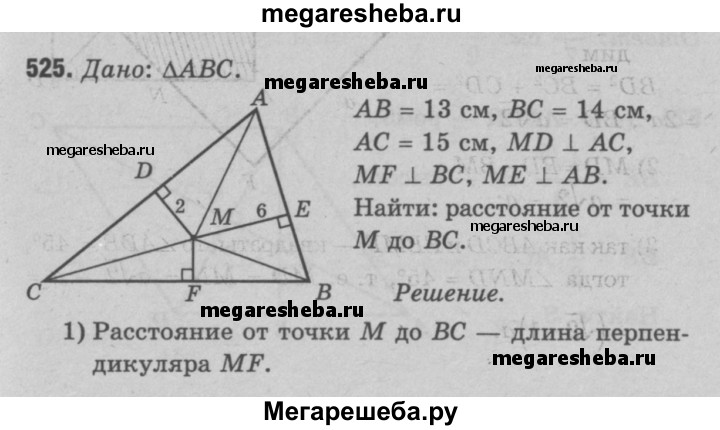 525 Расстояние от точки М, лежащей внутри треугольника ABC, до прямой АВ равно 6 см, а до прямой АС равно 2 см. Найдите расстояние от точки М до прямой ВС, если АВ = 13 см, ВС= 14 см, АС = 15 см.