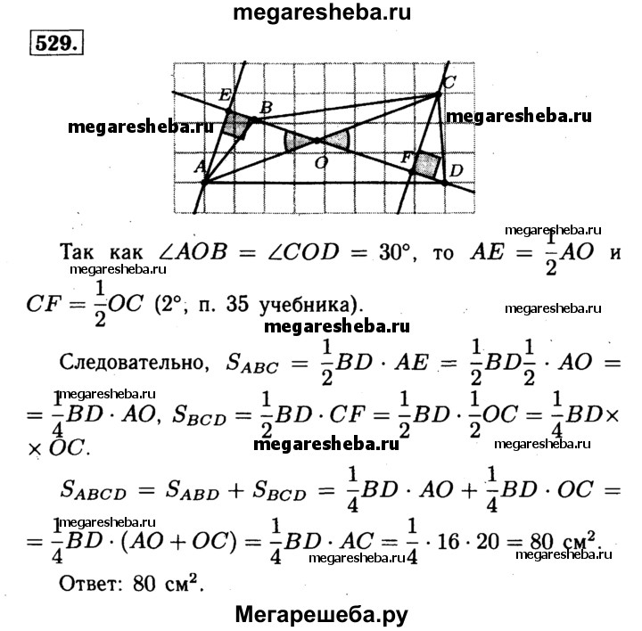 529 Диагонали четырёхугольника равны 16 см и 20 см и пересекаются под углом в 30°. Найдите площадь этого четырёхугольника.