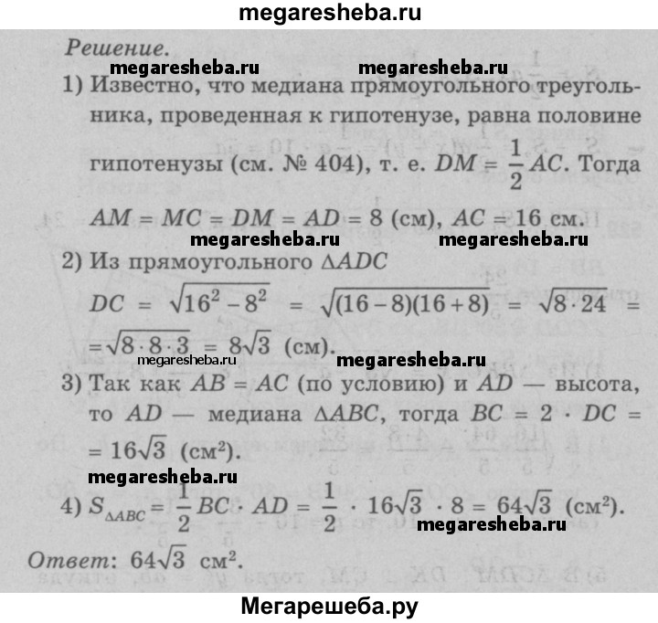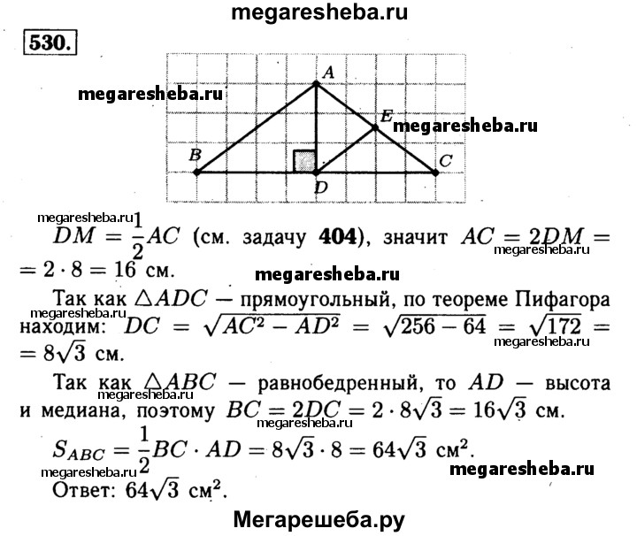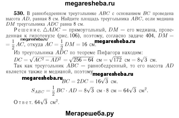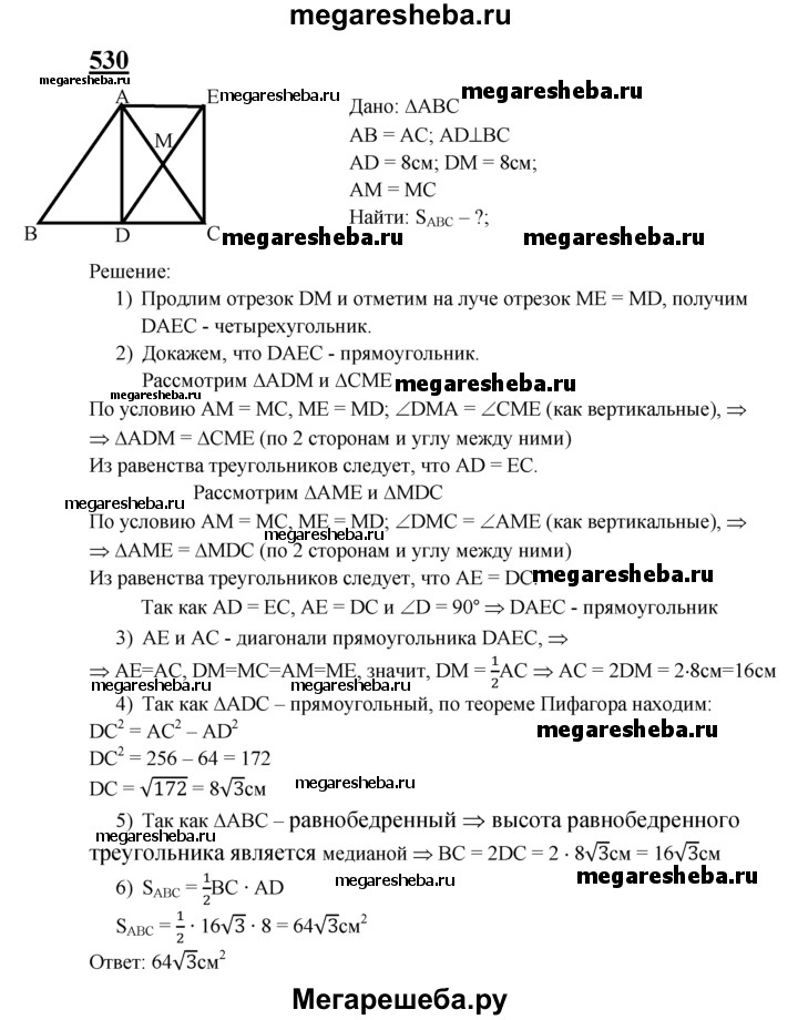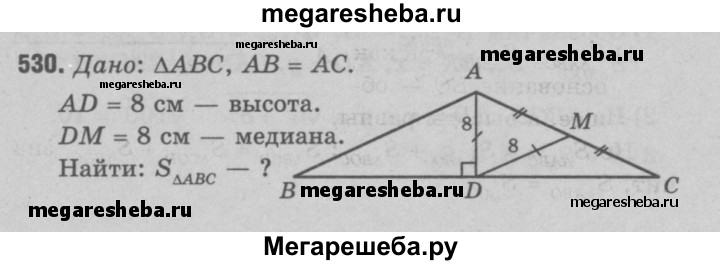 530 В равнобедренном треугольнике ABC с основанием ВС высота AD равна 8 см. Найдите площадь треугольника ABC, если медиана DM треугольника ADC равна 8 см.